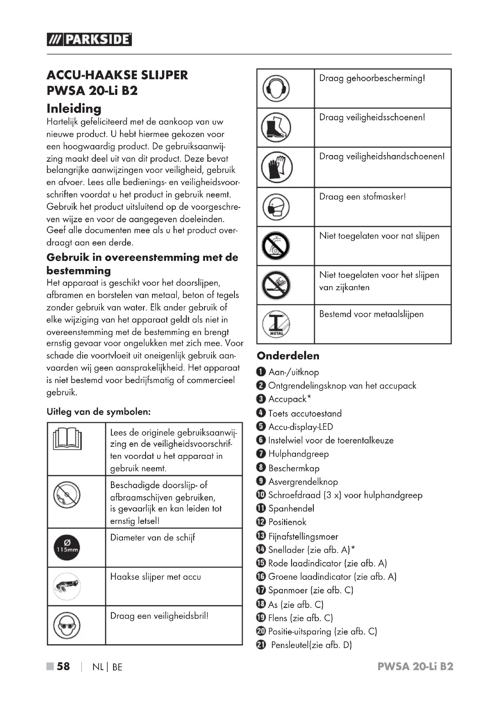 ACCU-HAAKSE SLIJPER PWSA 20-Li B2 Inleiding Hartelijk gefeliciteerd met de aankoop van uw nieuwe product. U hebt hiermee gekozen voor een hoogwaardig product. De gebruiksaanwij- zing maakt deel uit van dit product. Deze bevat belangrijke aanwijzingen voor veiligheid, gebruik en afvoer. Lees alle bedienings- en veiligheidsvoor- schriften voordat u het product in gebruik neemt. Gebruik het product uitsluitend op de voorgeschre- ven wijze en voor de aangegeven doeleinden. Geef alle documenten mee als u het product over- draagt aan een derde. Gebruik in overeenstemming met de bestemming Het apparaat is geschikt voor het doorslijpen, afbramen en borstelen van metaal, beton of tegels zonder gebruik van water. Elk ander gebruik of elke wijziging van het apparaat geldt als niet in overeenstemming met de bestemming en brengt ernstig gevaar voor ongelukken met zich mee. Voor schade die voortvloeit uit oneigenlijk gebruik aan- vaarden wij geen aansprakelijkheid. Het apparaat is niet bestemd voor bedrijfsmatig of commercieel gebruik. Uitleg van de symbolen: Lees de originele gebruiksaanwij- zing en de veiligheidsvoorschrif- ten voordat u het apparaat in gebruik neemt. Beschadigde doorslijp- of afbraamschijven gebruiken, is gevaarlijk en kan leiden tot ernstig letsel! Diameter van de schijf Haakse slijper met accu Draag een veiligheidsbril! Draag gehoorbescherming! Draag veiligheidsschoenen! Draag veiligheidshandschoenen! Draag een stofmasker! Niet toegelaten voor nat slijpen Niet toegelaten voor het slijpen van zijkanten Bestemd voor metaalslijpen Onderdelen Aan-/uitknop Ontgrendelingsknop van het accupack Accupack* Toets accutoestand Accu-display-LED Instelwiel voor de toerentalkeuze Hulphandgreep Beschermkap Asvergrendelknop Schroefdraad (3 x) voor hulphandgreep Spanhendel Positienok Fijnafstellingsmoer Snellader (zie afb. A)* Rode laadindicator (zie afb. A) Groene laadindicator (zie afb. A) Spanmoer (zie afb. C) As (zie afb. C) Flens (zie afb. C) Positie-uitsparing (zie afb. C)