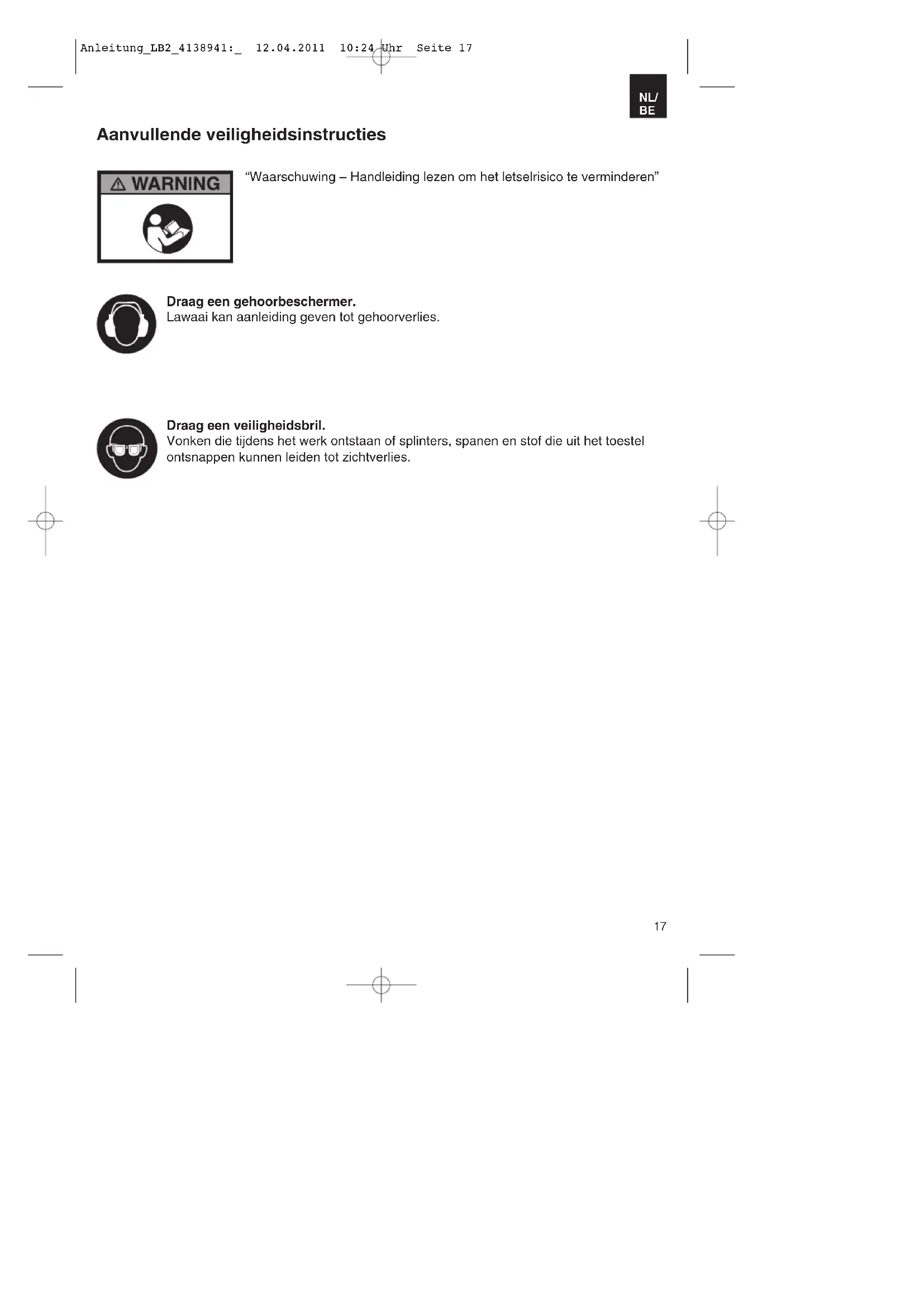 Aanvullende veiligheidsinstructies “Waarschuwing – Handleiding lezen om het letselrisico te verminderen” Draag een gehoorbeschermer. Lawaai kan aanleiding geven tot gehoorverlies. Draag een veiligheidsbril. Vonken die tijdens het werk ontstaan of splinters, spanen en stof die uit het toestel ontsnappen kunnen leiden tot zichtverlies. Anleitung_LB2_4138941:_ 12.04.2011 10:24 Uhr Seite 171. Inleiding Let op! Bij het gebruik van toestellen dienen enkele veiligheidsmaatregelen te worden nageleefd om lichamelijk gevaar en schade te voorkomen. Lees daarom deze handleiding / veiligheidsinstructies zorgvuldig door. Bewaar deze goed zodat u de informatie op elk moment kunt terugvinden. Mocht u dit toestel aan andere personen doorgeven, gelieve dan deze handleiding / veiligheidsinstructies mee te geven. Wij zijn niet aansprakelijk voor ongevallen of schade die te wijten zijn aan niet- naleving van deze handleiding en van de veiligheidsinstructies.