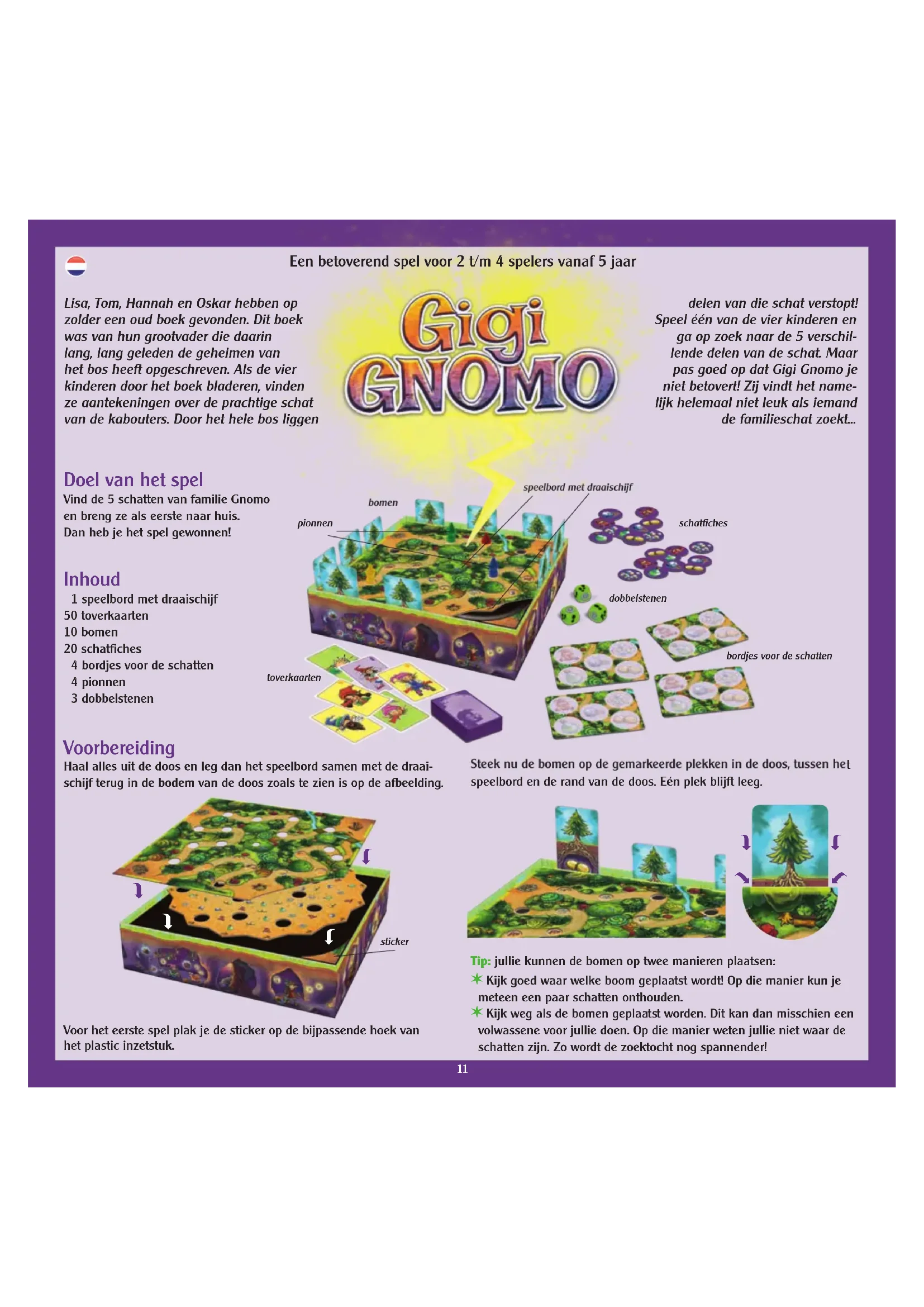 speelbord met draaischijf toverkaartenbomenschatfichesbordjes voor de schattendobbelstenenLisa, Tom, Hannah en Oskar hebben op zolder een oud boek gevonden. Dit boek was van hun grootvader die daarin lang, lang geleden de geheimen van het bos heeft opgeschreven. Als de vier kinderen door het boek bladeren, vinden ze aantekeningen over de prachtige schat van de kabouters. Door het hele bos liggen Doel van het spel Vind de 5 schatten van familie Gnomo en breng ze als eerste naar huis. Dan heb je het spel gewonnen! Inhoud 1 speelbord met draaischijf50 toverkaarten10 bomen20 schatfiches 4 bordjes voor de schatten 4 pionnen 3 dobbelstenendelen van die schat verstopt!Speel één van de vier kinderen en ga op zoek naar de 5 verschil-lende delen van de schat. Maar pas goed op dat Gigi Gnomo je niet betovert! Zij vindt het name-lijk helemaal niet leuk als iemand de familieschat zoekt... Een betoverend spel voor 2 t/m 4 spelers vanaf 5 jaar stickerpionnen12 Leg de schatfiches en de dobbelstenen naast het speelbord klaar.Schud de toverkaarten en leg ze ondersteboven op een stapel, zodat iedereen er goed bij kan. Elke speler pakt een bordje voor de schatten en legt dit voor zich neer. Nu mag iedereen nog een pion kiezen en deze op het startveld op het speelbord plaatsen.Nu kun je beginnen! Het spel zelf Er wordt met de wijzers van de klok mee gespeeld. Wie het kortst geleden in een bos is geweest mag beginnen. Gooi de drie dobbelstenen.Zijn er voetstappen op de dobbelstenen te zien?Dan mag je je pion net zo veel velden voo-ruit zetten als je voetstappen op alle drie de dobbelstenen ziet. Je hoeft niet het totale aantal velden vooruit te gaan, je mag ook eerder blijven staan. Maar je moet minstens één veld vooruit gaan. Je moet altijd vooruit gaan, achteruit is niet toegestaan. LET OP: gaten en velden waarop al andere spelers staan tellen niet mee! Deze sla je gewoon over.Op het veld waarop je terecht komt, is een schat te zien. Die moet je nu vinden! Trek daarvoor een boom uit de zijkant van de doos.Staat op de uitgetrokken boom dezelfde schat als op het veld waarop je staat?Goed gedaan! Je hebt de juiste schat gevonden. Heb je van deze schat nog geen fiche voor je liggen, dan mag je er een uit de voorraad pakken en op je bordje leggen. Van elke soort schat mag je maar één fiche voor je hebben liggen. Als je deze schat al voor je hebt liggen en ook een toverkaart, dan mag je de toverkaart wegdoen. Wat een toverkaart is, lees je later bij de uitleg van de aardkolk! Leg de kaart met de toverspreuk gewoon naast de stapel kaarten. Hier ontstaat tijdens het spel een aflegstapel.Vervolgens steek je de boom weer terug in de doos, maar niet op dezelf-de plek als waar je hem eruit hebt getrokken. Steek hem op de plek die aan het begin van je beurt leeg was. LET GOED OP! De bomen veranderen altijd van plaats als de juiste schat is gevonden!Staat op de uitgetrokken boom niet dezelfde schat als op het veld waarop je staat?Helaas! Je hebt niet de juiste schat gevonden. Steek de boom weer op dezelfde plek terug in de doos waar je hem eruit hebt getrokken. Zijn er aardkolken op de dobbelstenen te zien?Als je je pion vooruit hebt gezet of als je geen voetstappen hebt gedobbeld, kijk je na of je aardkolken hebt gedobbeld.Als je geen aardkolk hebt gedobbeld, is de volgende speler aan de beurt.Als je een of meerdere aardkolken hebt gedobbeld, draai je de draaischijf voor elke aardkolk één tand verder. Let daarbij op de richting van de pijl. Draai de schijf zo vlug en gelijkmatig mogelijk. Zodra er minstens een pion in een gat valt, moet je meteen ophouden met draaien. Aardkolken die je dan nog niet hebt gebruikt, vervallen.Zo draai je de draaischijf.Elke pion die tot aan zijn hoed in een gat zit, is door Gigi Gnomo betrapt. Wat een pech! Gigi Gnomo zegt nu haar toverspreuk. Alle spelers van wie de pionnen in een gat in het bos zijn gevallen, trekken nu een kaart van de toverkaartenstapel. Hierop is de toverspreuk te zien!startveld veld