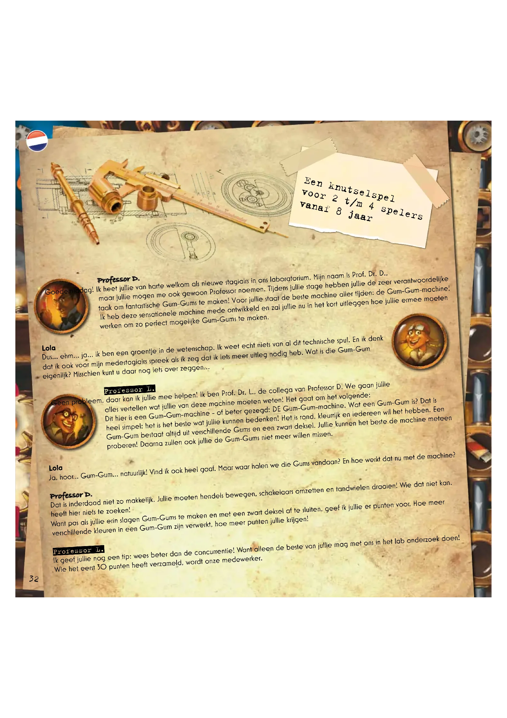 der een 2. Ze zet het handvat weer terug in het gat en zoekt getallenschakelaar 2. Ze schuift de schakelaar in de vrije richting. Nu stoot de schakelaar op de oranje buis. Ze volgt de buis tot aan de eerste Gum-opslagplaats. De eerste Gum is groen, de tweede geel en de derde paars. Groen heeft ze al voor zich liggen. Geel en paars ontbreken nog. Ze kiest voor de gele Gum, haalt deze uit het vak en legt hem op haar groene Gum. In het vak is nu een tandwiel te zien. Lola springt naar het tandwiel en volgt de nieuwe buis. Ze had ook de gele Gum kunnen laten liggen en de paarse kunnen pakken. Onder de paarse Gum zit geen symbool. Ze had dan verder de oranje buis kunnen volgen en de draaischijf kunnen draaien. Maar ze zou niet nog een keer terug mogen gaan om de gele Gum te pakken. Lola had in geen geval bijvoorbeeld de paarse Gum mogen pakken en dan naar beneden naar de blauwe Gum mogen gaan, omdat ze dan van buiskleur zou zijn gewisseld. Professor L. Maar nu weer terug naar de machine. Er zijn nog enkele plekken die jullie moeten kennen: Symbolen die in de machine kunnen opduiken tandwiel, kolf, vlam Direct onder de startschuiver staan de machinedelen tandwiel, kolf en vlam. Hiermee kunnen jullie de buizen activeren die eronder lopen. Daarvoor moeten jullie ergens in de machine een van de bijpassende symbolen voor het tandwiel, de kolf of de vlam vinden (bijvoorbeeld onder een Gum, in een ketel, enz.). Als je een van deze symbolen hebt gevonden, moet je meteen naar het bijbehorende deel van de machine gaan en de nieuwe buis volgen.39 componenten en de machine Vloeibare veredeling Roer in de ketel. Draai de afdekking een kwart in de richting van de pijl verder. Voer het nieuwe symbool uit. Als het symbool een machine-element is, ga je meteen verder vanaf de plek die door dat symbool wordt aangegeven. Als het symbool een dubbele Gum is, mag je bij je medespelers een ‘kwaliteitscontrole’ uitvoeren! Kijk eens naar hun Gum-Gum-stapels. Alle medespelers moeten jou één Gum geven, van één van de twee afgebeelde kleuren, als ze zo’n Gum hebben. Jij mag zelf de kleur kiezen! Als je die kleur nog niet had, mag je hem op je stapel leggen om die daarmee te verbeteren. Als je die kleur al in je stapel had, moet je de Gum in de voorraad leggen. Nog enkele symbolen Als jullie de machine bedienen, zullen jullie nog enkele symbolen tegenkomen. Jullie zullen symbolen vinden die bepaalde machinedelen in het klein tonen. Als je een van deze symbolen tegenkomt, laat je alles staan en liggen en ga je meteen vanuit de plek verder die het symbool aantoont. Hier een voorbeeld: Lola heeft getallenschakelaar 2 geactiveerd en haalt de derde Gum (paars) uit het vak. Daaronder duikt het symbool van de blauwe ketel op. Ze gaat meteen naar de blauwe ketel, draait de afdekking een kwart in de richting van de pijl verder en volgt het symbool dat daar tevoorschijn komt. De lopende band Trek 2 Gums uit de voorraad en schuif deze van boven onder de lopende-bandafdekking. Aan de onderkant komen er nu twee Gums uit. Als je deze kleuren nog niet in je Gum-Gum voor je hebt liggen, moet je beide kleuren in je Gum- Gum inbouwen. Als je een kleur of beide kleuren al in je Gum-Gum hebt, neem je alleen de kleur die je nog niet hebt. De andere doe je terug in de voorraad. Als je een zwart deksel hebt getrokken, moet je je Gum-Gum af maken en de punten tellen. Na de band is je zet in elk geval voorbij. Kruisschakelaars Schuif een van de twee schakelaars naar de tegenoverliggende positie en voer het symbool uit dat nu tussen de twee schakelaars ligt. De schakelaars mogen niet de hoek om en niet in het midden van het kruis blijven staan.40 De kwaliteitscontrole Hier kun je tussendoor eens testen hoe goed je Gum-Gum is. Laat de pijl draaien. De twee kleuren waarop de wijzer blijft staan zijn van bijzonder hoge kwaliteit! Als je de getoonde Gum- kleuren al voor je hebt liggen, krijg je voor elke aangetoonde kleur een punt. Markeer deze punten meteen met je tandwiel op de puntenlijst. Je zet is nu voorbij. De onderhoudswijzer Bekijk alle Gum-vakken van de machine en leg in elk vak waar een symbool te zien is een Gum uit de voorraad. Laat de pijl draaien. Het symbool dat nu wordt aangeduid heeft een onderhoudsbeurt nodig. Vind dit symbool onder de Gums. Als de wijzer bijvoorbeeld op de vlam wijst, moet je het vlamsymbool vinden. Til de Gum waaronder je dit symbool vermoedt iets op en bekijk welk symbool er daadwerkelijk onder zit. Als je de eerste keer niet het juiste symbool weet te vinden, mag je het nog een keer proberen!Heb je het juiste symbool gevonden, dan mag je meteen je route vanuit het bijpassende machinedeel voortzetten.Heb je niet het juiste symbool gevonden, is je zet voorbij. Drukwijzer Als je de drukwijzer bereikt, wordt de druk in de machine berekend. Tel alle zichtbare zwarte Gum-deksels. Zet dan de pijl op deze waarde. Vervolgens moet je naar de schakelaar met het bijbehorende getal springen en je zet van daaruit voortzetten door de schakelaar om te zetten en de buis te volgen.Als er meer dan 5 zwarte deksels in de machine liggen, is er overdruk. Tik een keer tegen de wijzer. Haal dan zo veel zwarte deksels uit de machine dat er nu evenveel deksels over zijn als de wijzer aangeeft. Leg ze terug in de voorraad. Als de pijl na het tikken op het bruine overdrukveld blijft staan, tik dan gewoon nog een keer. Daarna is je zet voorbij. Toevallige steekproef Tik tegen de pijl. Activeer de schakelaar met het getal dat de pijl aangeeft en speel vanuit deze plek verder. Tip: Als jullie meer toeval in het spel willen, kunnen jullie het beste met de draaischijf „Toevallige steekproef“ spelen en veel inlegelementen gebruiken waarop deze draaischijf te zien is. Beide Professors Maar nu zouden jullie genoeg moeten weten om met de machine te kunnen werken! Als er nog vragen zijn, stuur ons dan een e-mail via de hieronder aangegeven website. Veel succes! info