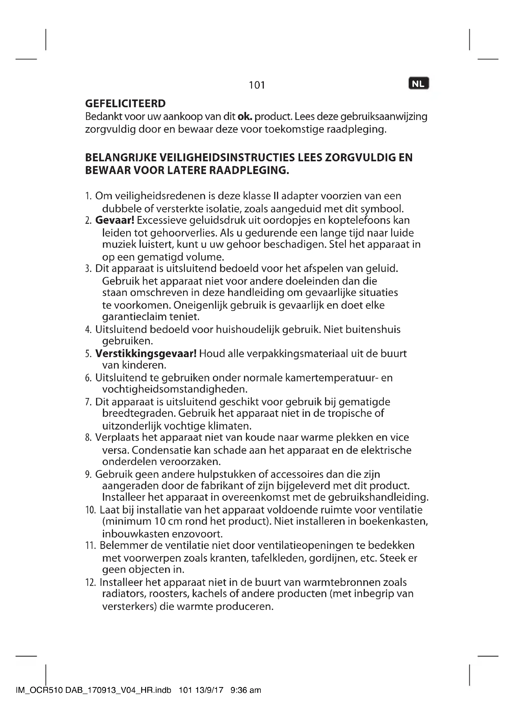 - Plaats het apparaat ergens anders en stel de antenne opnieuw in. SPECIFICATIES ADAPTER ADAPTER Ingang : 100 - 240 V~ / 50/60 Hz Uitgang : 6 V 0,5 A DAB RADIO Ingang : 6 V 0,5 A Stroomverbruik bij gebruik : 3 W Standby energieverbruik : < 1 W Afstembereik (Tuner DAB) : 174 - 240 MHz Afstembereik (Tuner FM) : 87,5 - 108 MHz Afstemraster (Tuner FM) : 0,05 MHz Afmetingen (B x H x D) : 100 x 113 x 100 mm Gewicht : Ca. 0,9 kg AFVAL Gooi het apparaat niet weg als gewoon huisafval. Lever het in bij de hiervoor bestemde AEEA recyclepunten. Door dit te doen, helpt u middelen te behouden en het milieu te beschermen. Neem contact op met uw dealer of met de lokale autoriteiten voor meer informatie. IM_OCR510 DAB_170913_V04_HR.indb 114 13/9/17 9:36 am115