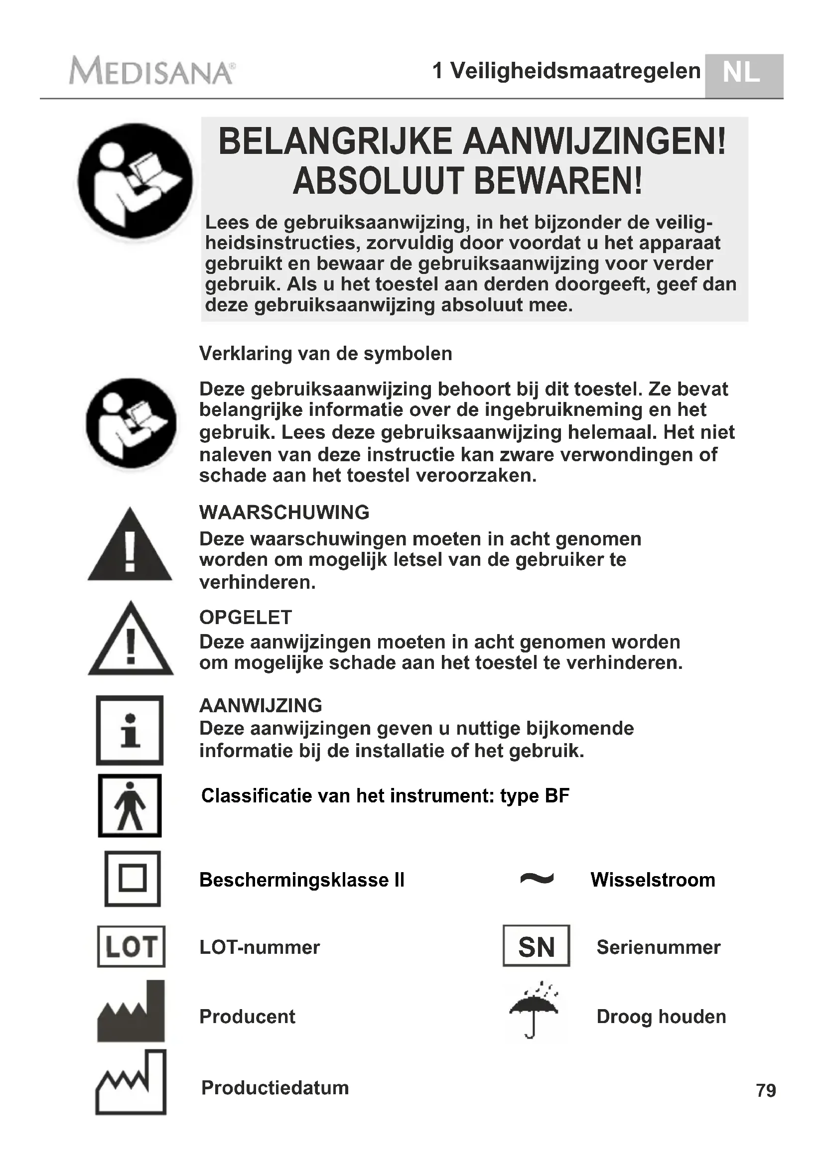 BELANGRIJKE AANWIJZINGEN! ABSOLUUT BEWAREN! LOT-nummer Serienummer Producent ProductiedatumClassificatie van het instrument: type BF Beschermingsklasse II WisselstroomLees de gebruiksaanwijzing, in het bijzonder de veilig-heidsinstructies, zorvuldig door voordat u het apparaatgebruikt en bewaar de gebruiksaanwijzing voor verder gebruik. Als u het toestel aan derden doorgeeft, geef dan deze gebruiksaanwijzing absoluut mee.Verklaring van de symbolenDeze gebruiksaanwijzing behoort bij dit toestel. Ze bevatbelangrijke informatie over de ingebruikneming en hetgebruik. Lees deze gebruiksaanwijzing helemaal. Het nietnaleven van deze instructie kan zware verwondingen ofschade aan het toestel veroorzaken.WAARSCHUWINGDeze waarschuwingen moeten in acht genomen worden om mogelijk letsel van de gebruiker te verhinderen.OPGELETDeze aanwijzingen moeten in acht genomen wordenom mogelijke schade aan het toestel te verhinderen.AANWIJZINGDeze aanwijzingen geven u nuttige bijkomendeinformatie bij de installatie of het gebruik.