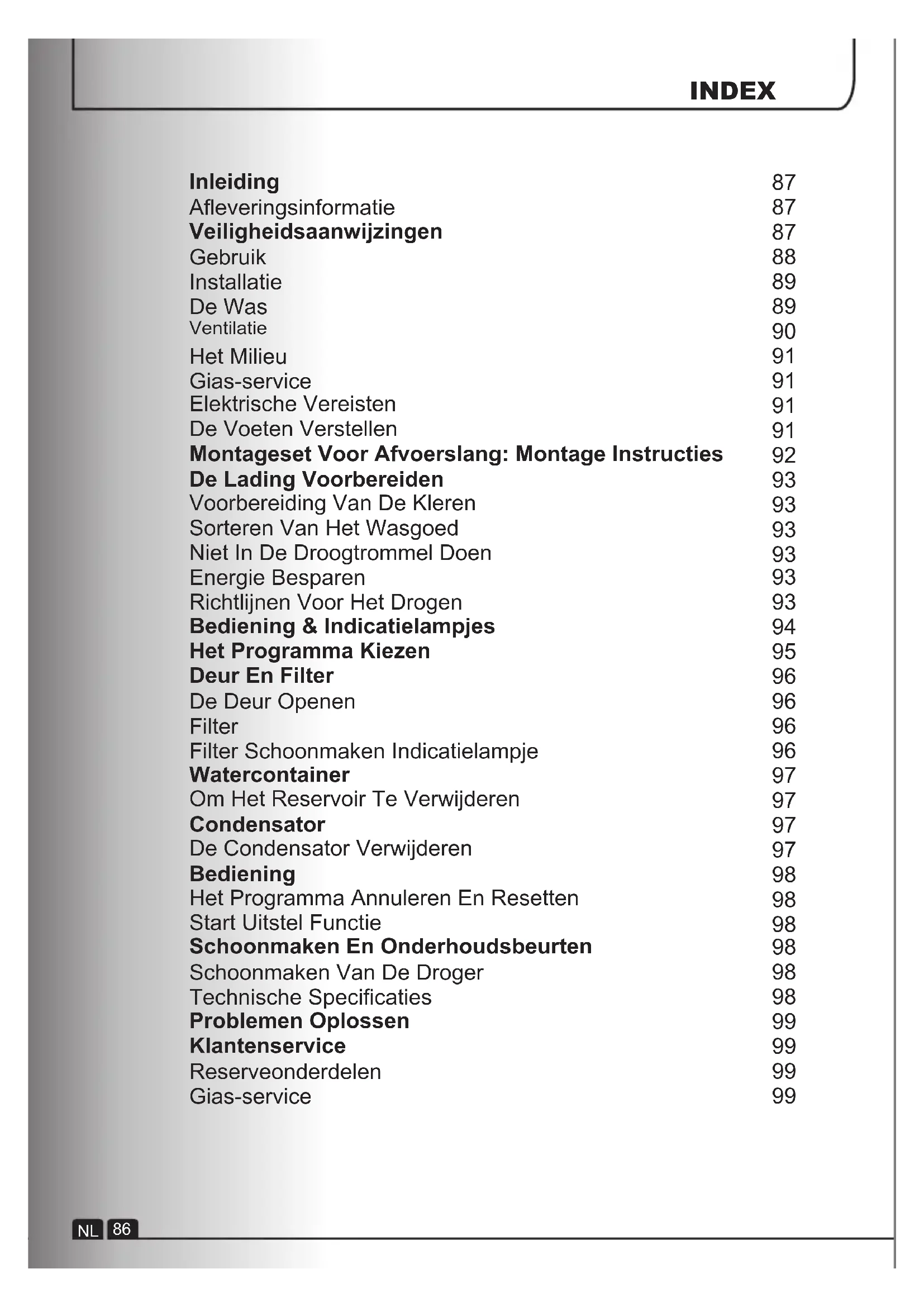 Bekijk altijd de wasvoorschriften op het wasgoed om te controleren of u het in de droger mag drogen. Kleren moeten gecentrifugeerd of grondig uitgewrongen worden, voordat zij in de droogtrommel gestopt worden. Druipnatte kleren mogen NIET in de droger gestopt worden. Aanstekers en lucifers mogen niet in zakken blijven zitten en gebruik NOOIT ontvlambare vloeistoffen in de buurt van het apparaat. Glasvezelgordijnen mogen NOOIT in dit apparaat worden gestopt. Er kunnen zich huidirritaties voordoen als andere kledingstukken met de glasvezels in aanraking geweest zijn. Wasgoed dat is verontreinigd met substanties, zoals kookolie, aceton, alcohol, petroleum, kerosine, vlekverwijderaars, t e r p e t i n e , w a x e n waxverwijderaars, moeten in heet water gewassen worden met extra wasmiddel voordat ze in de droogtrommel worden gedroogd. W a s v e r z a c h t e r s e n vergelijkbare producten moeten worden gebruikt volgens de A a n w i j z i n g e n d i e o p d e wasverzachter staan vermeld. De Was NL 89INSTALLATIE De kamer waarin de droger geplaatst wordt, moet voldoende geventileerd worden om te voorkomen dat gassen van mechanismen die werken via brandstofverbranding, zoals een open haard, in de kamer gezogen worden wanneer de droger in werking is. Afzuiglucht mag niet in een via een afvoer waarlangs uitlaatstoffen van mechanismen die gas of andere brandstoffen verbranden, worden afgevoerd. Controleer regelmatig dat de lucht die door de droger stroomt, niet geblokkeerd wordt. Controleer regelmatig de pluizenfilter na gebruik en maak proper indien nodig. Er dient een minimale afstand van 12 mm te zijn tussen de machine en eventuele belemmeringen. De in- en uitlaat moeten vrij zijn van obstakels. Bewaar voldoende ventilatieruimte tussen de bodem van de machine en de vloer. Voorkom dat artikelen achter de droger vallen of zich daar ophopen omdat deze de luchtaanvoer en afvoer kunnen belemmeren. Installeer de droger NOOIT tegen gordijnen aan. De achterkant van het apparaat installeren dichtbij een muur of een verticale oppervlakte