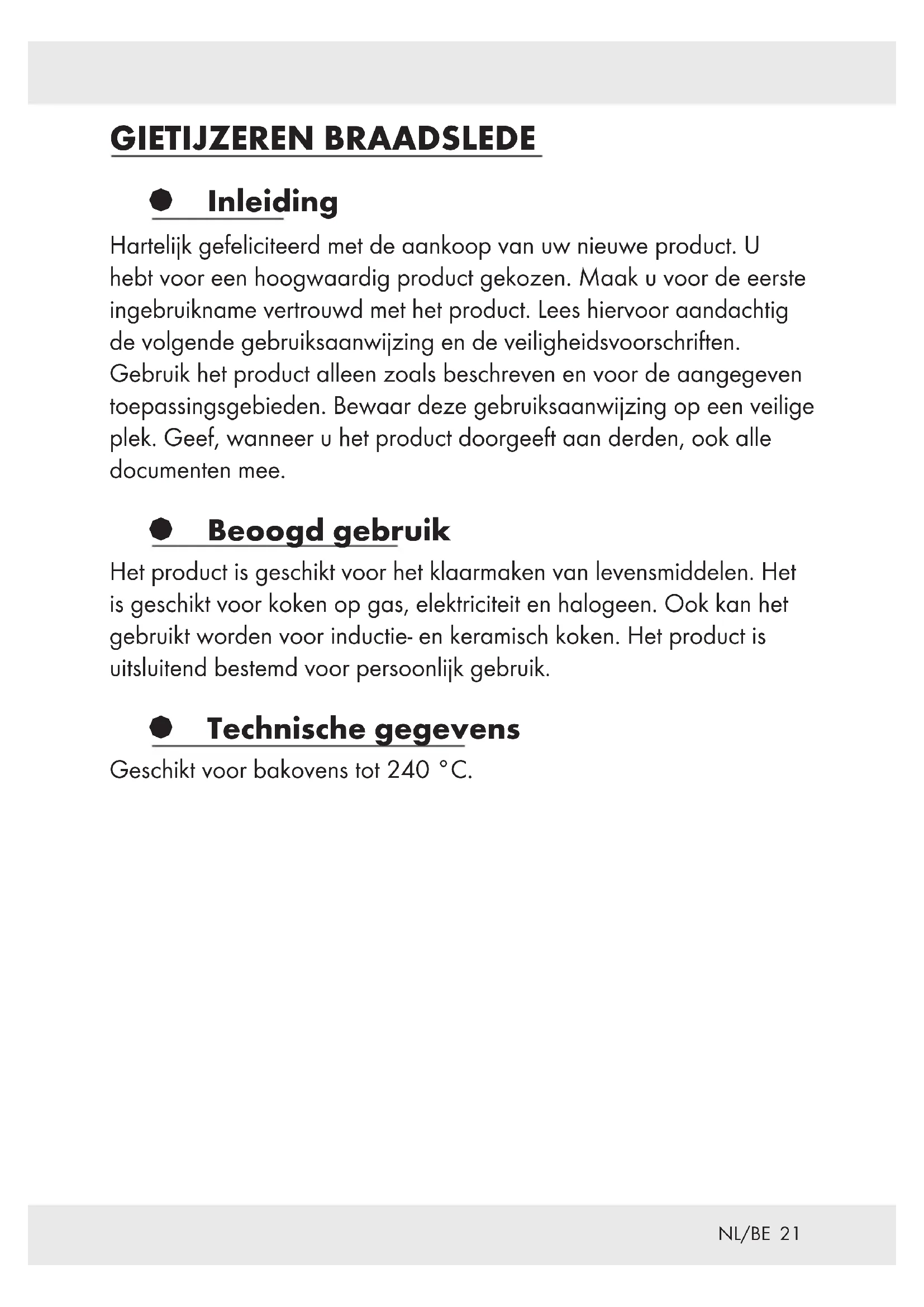 VOORZICHTIG! Houd er rekening mee dat de emaillaag bij een val of een harde stoot beschadigd kan raken. § Afvoer De verpakking bestaat uit milieuvriendelijke grondstoffen die u via de plaatselijke recyclingcontainers kunt afvoeren. Informatie over de mogelijkheden om het uitgediende product na gebruik te verwijderen, verstrekt uw gemeentelijke overheid.26 NL/BE § Garantie Het product wordt volgens strenge kwaliteitsrichtlijnen zorgvuldig geproduceerd en voor levering grondig getest. In geval van schade aan het product kunt u rechtmatig beroep doen op de verkoper van het product. Deze wettelijke rechten worden door onze hierna vermelde garantie niet beperkt. Op dit product verlenen wij 3jaar garantie vanaf aankoopdatum. De garantieperiode start op de dag van aankoop. Bewaar de originele kassabon alstublieft. Dit document is nodig als bewijs voor aankoop. Wanneer binnen 3jaar na de aankoopdatum van dit product een materiaal- of productiefout optreedt, dan wordt het product door ons –naar onze keuze– gratis voor u gerepareerd of vervangen. Deze garantie komt te vervallen als het product beschadigd wordt, niet correct gebruikt of onderhouden wordt. De garantie geldt voor materiaal- en productiefouten. Deze garantie is niet van toepassing op productonderdelen, die onderhevig zijn aan normale slijtage en hierdoor als aan slijtage onderhevige onderdelen gelden (bijv. batterijen) of voor beschadigingen aan breekbare onderdelen, zoals bijv. schakelaars, accu’s of dergelijke onderdelen, die gemaakt zijn van glas.27 DE/AT/CH GUSSEISEN-BRÄTER § Einleitung Wir beglückwünschen Sie zum Kauf Ihres neuen Produkts. Sie haben sich damit für ein hochwertiges Produkt entschieden. Machen Sie sich vor der ersten Inbetriebnahme mit dem Produkt vertraut. Lesen Sie hierzu aufmerksam die nachfolgende Bedienungsanleitung und die Sicherheitshinweise. Benutzen Sie das Produkt nur wie beschrieben und für die angegebenen Einsatzbereiche. Bewahren Sie diese Anleitung an einem sicheren Ort auf. Händigen Sie alle Unterlagen bei Weitergabe des Produktes an Dritte mit aus. § Bestimmungsgemäße Verwendung Das Produkt ist zum Zubereiten von Lebensmitteln geeignet. Es ist geeignet für Gas-, Elektro-, Halogen-, Induktions- und Glaskeramikkochfelder. Das Produkt ist ausschließlich für den privaten Gebrauch bestimmt. § Technische Daten Backofengeeignet bis 240 °C.28 DE/AT/CH Sicherheitshinweise