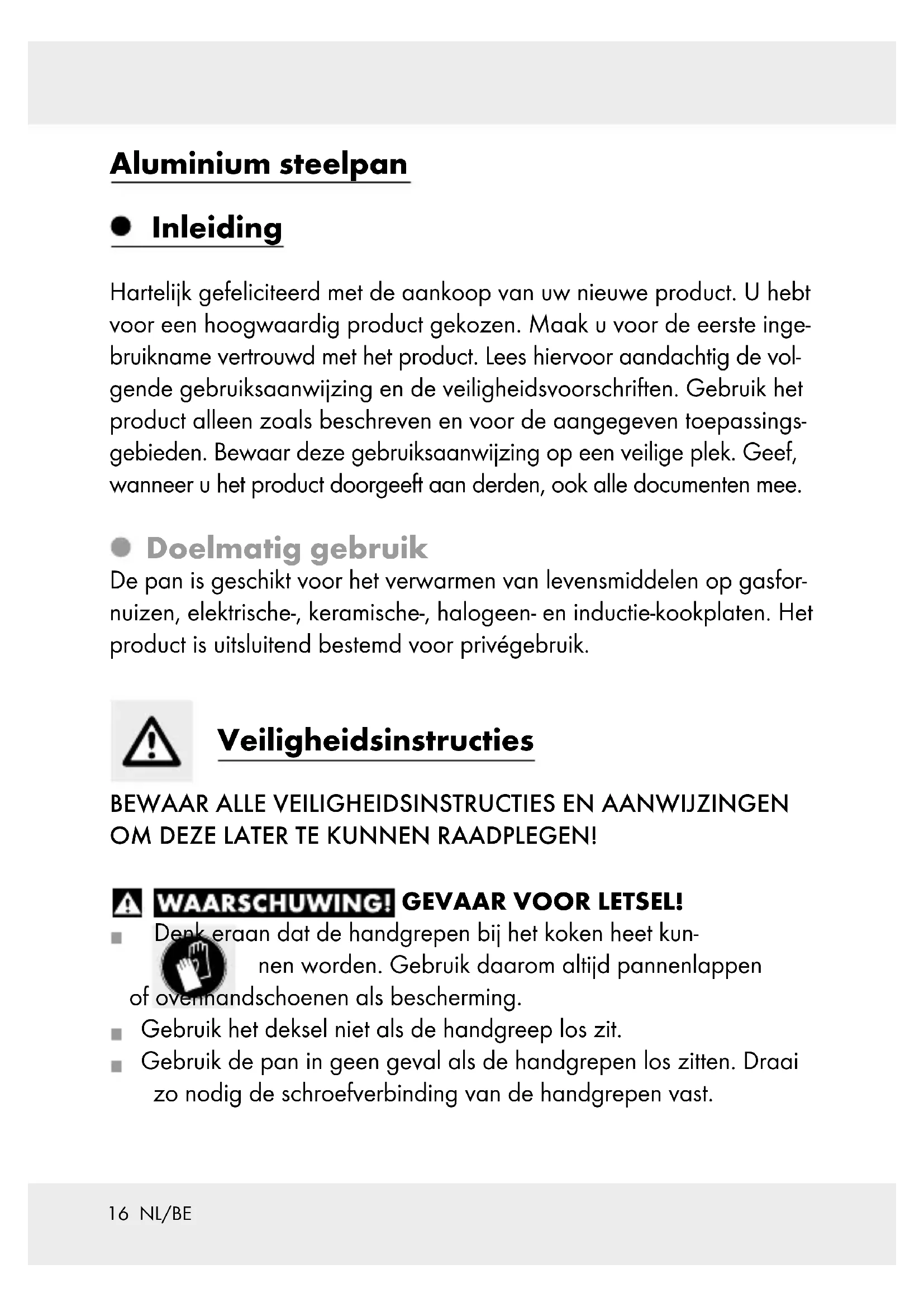 OM DEZE LATER TE KUNNEN RAADPLEGEN! GEVAAR VOOR LETSEL! Denk eraan dat de handgrepen bij het koken heet kun- nen worden. Gebruik daarom altijd pannenlappen of ovenhandschoenen als bescherming. Gebruik het deksel niet als de handgreep los zit. Gebruik de pan in geen geval als de handgrepen los zitten. Draai zo nodig de schroefverbinding van de handgrepen vast.17 NL/BE