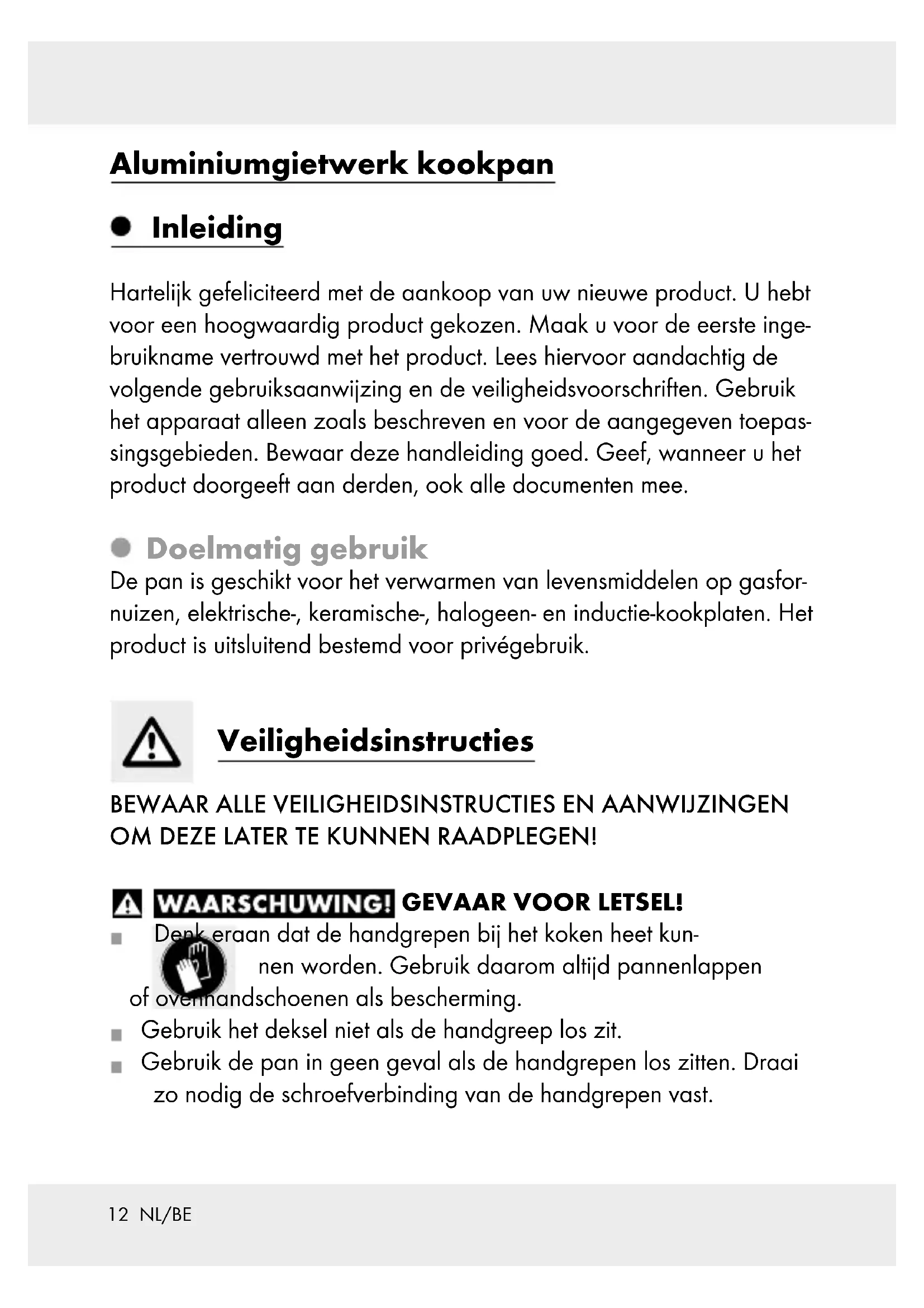 OM DEZE LATER TE KUNNEN RAADPLEGEN! GEVAAR VOOR LETSEL! Denk eraan dat de handgrepen bij het koken heet kun- nen worden. Gebruik daarom altijd pannenlappen of ovenhandschoenen als bescherming. Gebruik het deksel niet als de handgreep los zit. Gebruik de pan in geen geval als de handgrepen los zitten. Draai zo nodig de schroefverbinding van de handgrepen vast.13 NL/BE