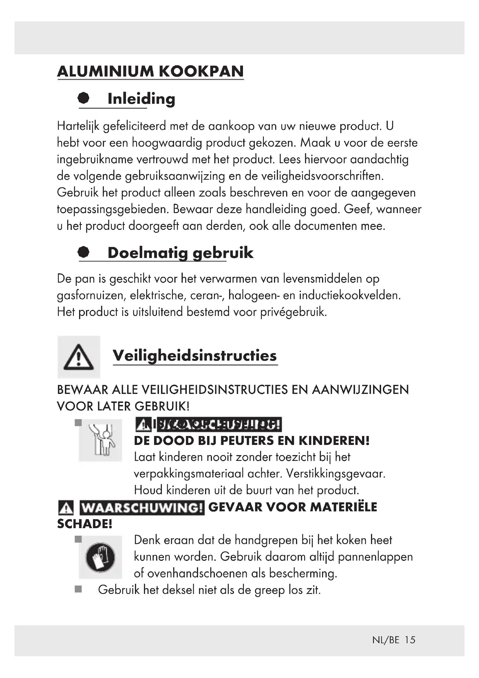 Denk eraan dat de handgrepen bij het koken heet kunnen worden. Gebruik daarom altijd pannenlappen of ovenhandschoenen als bescherming. Gebruik het deksel niet als de greep los zit.16 NL/BE Gebruik de pan in geen geval als de handgrepen los zitten. Draai zo nodig de schroefverbinding van de handgrepen vast.