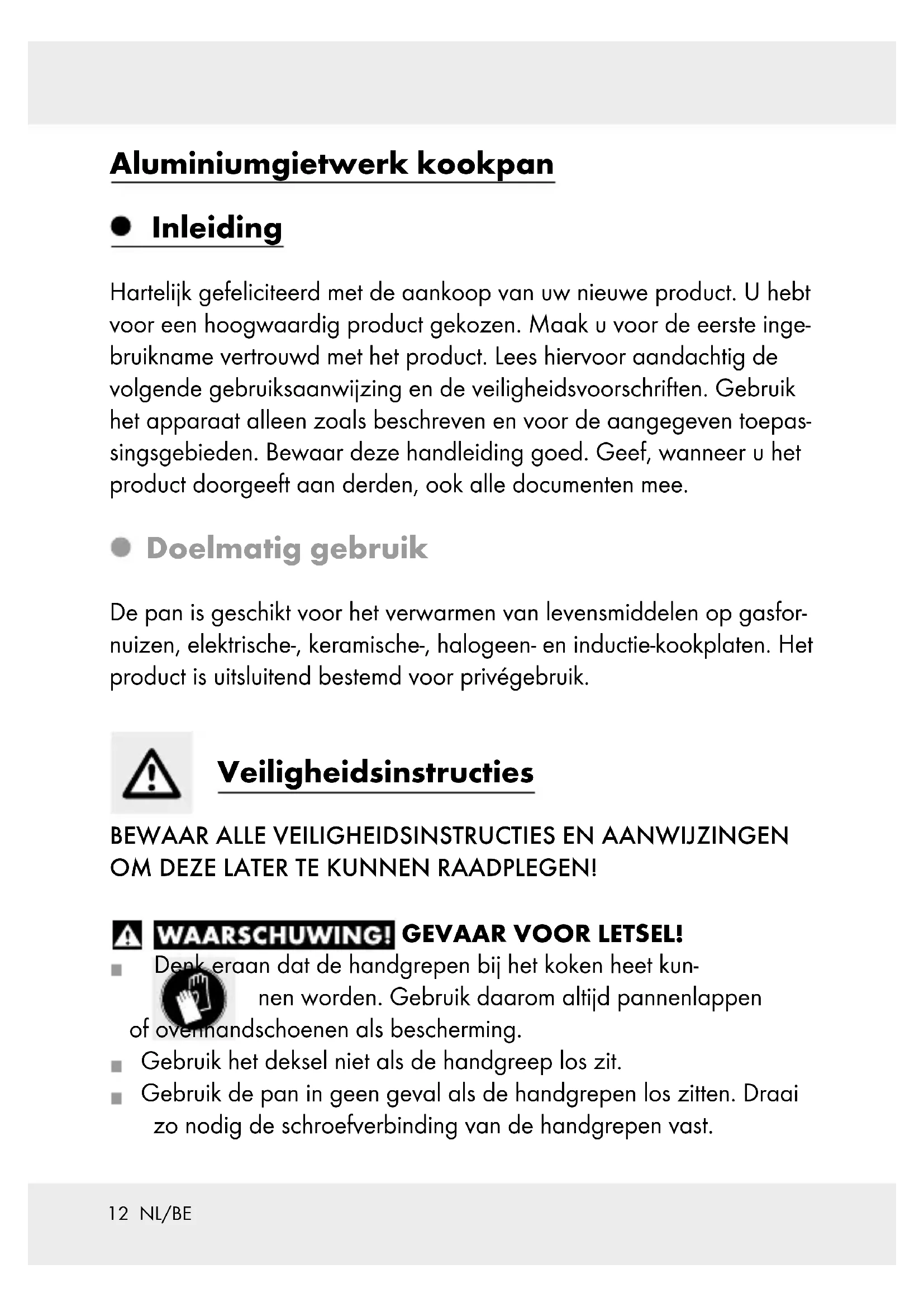 OM DEZE LATER TE KUNNEN RAADPLEGEN! GEVAAR VOOR LETSEL! Denk eraan dat de handgrepen bij het koken heet kun- nen worden. Gebruik daarom altijd pannenlappen of ovenhandschoenen als bescherming. Gebruik het deksel niet als de handgreep los zit. Gebruik de pan in geen geval als de handgrepen los zitten. Draai zo nodig de schroefverbinding van de handgrepen vast.13 NL/BE