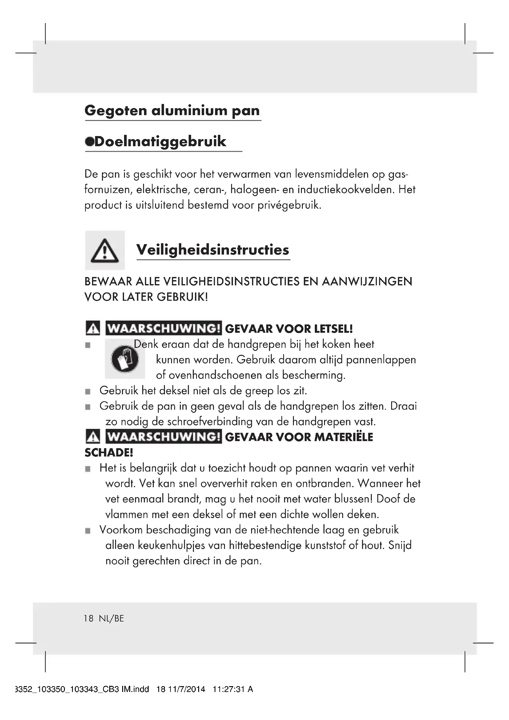 SCHADE! Het is belangrijk dat u toezicht houdt op pannen waarin vet verhit wordt. Vet kan snel oververhit raken en ontbranden. Wanneer het vet eenmaal brandt, mag u het nooit met water blussen! Doof de vlammen met een deksel of met een dichte wollen deken. Voorkom beschadiging van de niet-hechtende laag en gebruik alleen keukenhulpjes van hittebestendige kunststof of hout. Snijd nooit gerechten direct in de pan. 103352_103350_103343_CB3 IM.indd 18 11/7/2014 11:27:31 AM19 NL/BE Leg geen druipend vlees in heet vet. Door op de gloeiende fornuisplaat spattend vet kan snel een brand ontstaan. Voorkom hitteverlies en kies een kookplaat met een diameter die bij de panbodem past. Het artikel is geschikt voor het warmhouden van gerechten in de bakoven (max. 180 °C gedurende 1 uur). Het product is geschikt voor de vaatwasmachine. De regelmatige reiniging met scherpe reinigingsmiddelen kan leiden tot schade aan en / of verkleuring van de pan. De reiniging in de vaatwasser kan leiden tot verkleuringen van de aluminium onderdelen. OPGELET! Het glazen deksel is breekbaar / niet stootvast! Was de pan en het deksel af in een sopje van heet water met een gangbaar afwasmiddel. Gebruik daarbij géén scherpe en spitse voorwerpen die het materiaal zouden kunnen beschadigen. Trek of schuif de pan niet over de ceran- of halogeen-kookplaat. Het negeren van deze aanwijzingen kan krassen op de kookplaat veroorzaken. Opgelet, tijdens het gebruik van dit product kan er een lichte ver- kleuring ontstaan die aan de lichte kleur van het product is te wij- ten. Dergelijke verkleuring wijst op slijtage en heeft geen invloed op de kwaliteit van de coating en de gebruiksgeschiktheid van het product. P Opmerking voor inductiekookplaten J Opmerking: In bepaalde omstandigheden kan er lawaai optreden. Dit wordt veroorzaakt door de elektromagnetische eigenschappen van de warmtebron en de pot/ pan. J Dit is normaal en wijst niet op een defect van uw inductiekookplaat of kookgerei. 103352_103350_103343_CB3 IM.indd 19 11/7/2014 11:27:31 AM20 NL/BE J Plaats de pot/ pan in het midden van de inductiekookplaat. J OPGELET! Hoge opwarmsnelheid! Oververhit het kookgerei niet tijdens het voorverwarmen. J In geval van oververhitting, verlucht de kamer grondig. Gebruik Verwijder vóór het eerste gebruik eventuele stickers van de pan en spoel hem uit met heet water. Kook de pan vóór het eerste gebruik eerst 2–3 maal met water uit om eventuele productieresten helemaal te verwijderen. Oververhit de pot niet wanneer leeg of gevuld om mogelijke schade aan de antiaanbaklaag te voorkomen. Afvoer De verpakking bestaat uit milieuvriendelijke materialen die u via de plaatselijke recyclingdiensten kunt afvoeren. Informatie over de mogelijkheden, om het artikel na gebruik als huisvuil af te voeren, verstrekt uw gemeentelijke overheid. 103352_103350_103343_CB3 IM.indd 20 11/7/2014 11:27:31 AM21 DE/AT/CH Aluguss-Topf Bestimmungsgemäße Verwendung Der Topf ist zum Erhitzen von Lebensmitteln auf Gas-, Elektro-, Glaske- ramik-, Halogen- und Induktions-Kochfeldern geeignet. Das Produkt ist ausschließlich für den privaten Gebrauch bestimmt. Sicherheitshinweise