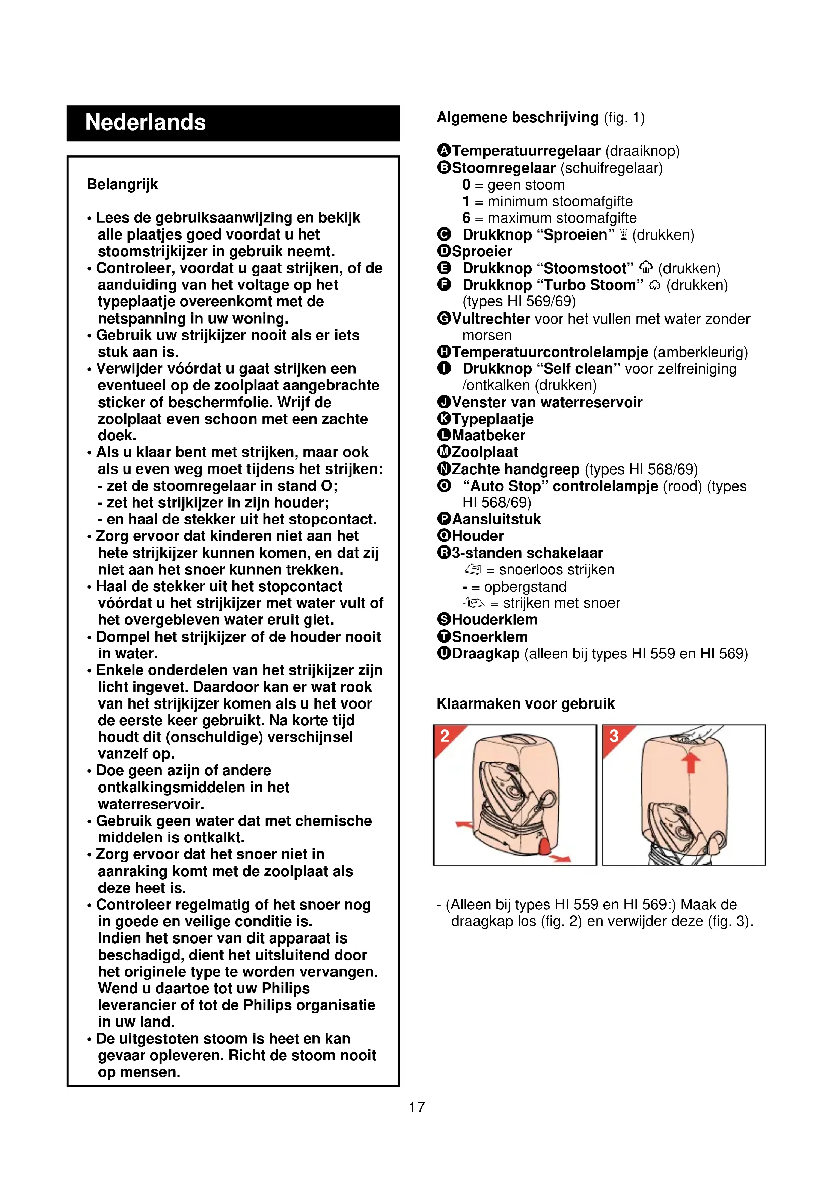 CLICKNederlands Algemene beschrijving (fig. 1) A Temperatuurregelaar (draaiknop) B Stoomregelaar (schuifregelaar) 0 = geen stoom 1 = minimum stoomafgifte 6 = maximum stoomafgifte C Drukknop “Sproeien” T (drukken) D Sproeier E Drukknop “Stoomstoot” 9 (drukken) F Drukknop “Turbo Stoom” 0 (drukken) (types HI 569/69) G Vultrechter voor het vullen met water zonder morsen H Temperatuurcontrolelampje (amberkleurig) I Drukknop “Self clean” voor zelfreiniging /ontkalken (drukken) J Venster van waterreservoir K Typeplaatje L Maatbeker M Zoolplaat N Zachte handgreep (types HI 568/69) O “Auto Stop” controlelampje (rood) (types HI 568/69) P Aansluitstuk Q Houder R 3-standen schakelaar ∫ = snoerloos strijken - = opbergstand ª = strijken met snoer S Houderklem T Snoerklem U Draagkap (alleen bij types HI 559 en HI 569) Klaarmaken voor gebruik - (Alleen bij types HI 559 en HI 569:) Maak de draagkap los (fig. 2) en verwijder deze (fig. 3).