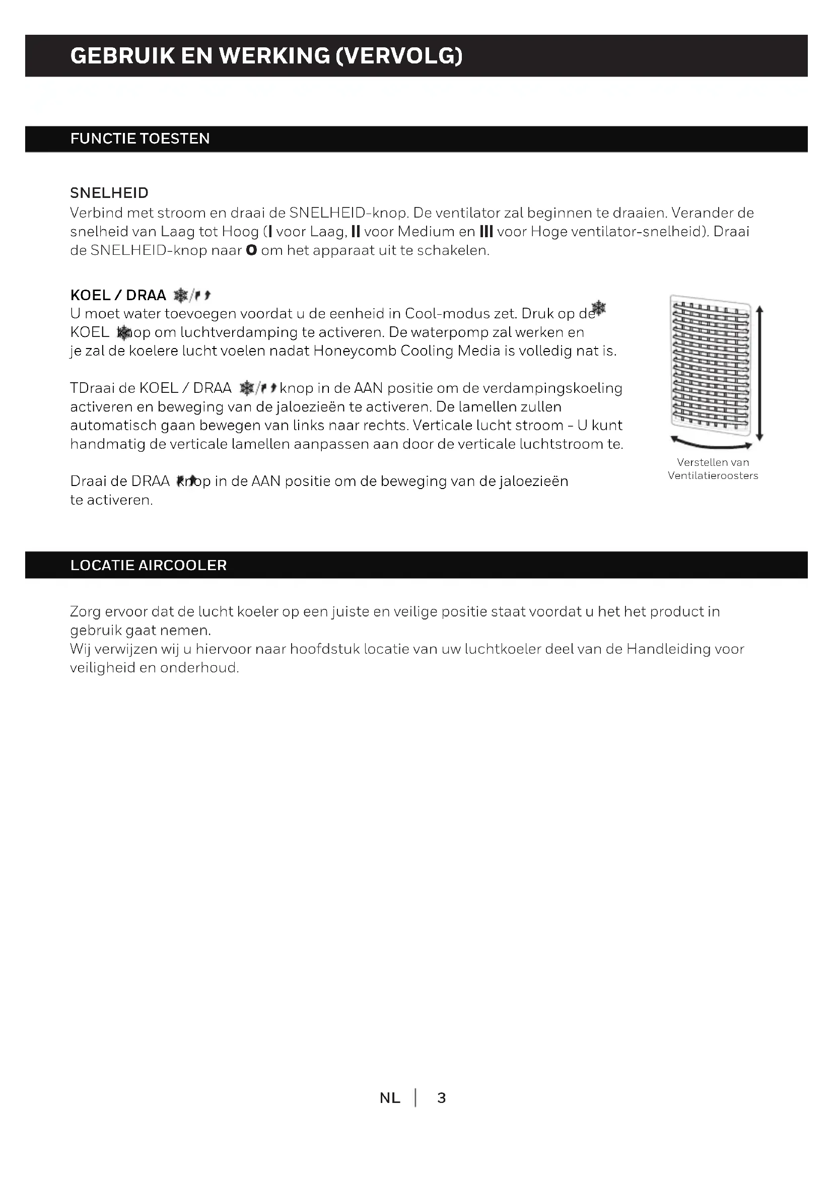 FUNCTIE TOESTEN Verstellen van Ventilatieroosters SNELHEID Verbind met stroom en draai de SNELHEID-knop. De ventilator zal beginnen te draaien. Verander de snelheid van Laag tot Hoog (| voor Laag, || voor Medium en ||| voor Hoge ventilator-snelheid). Draai de SNELHEID-knop naar O om het apparaat uit te schakelen. KOEL / DRAA U moet water toevoegen voordat u de eenheid in Cool-modus zet. Druk op de KOEL knop om luchtverdamping te activeren. De waterpomp zal werken en je zal de koelere lucht voelen nadat Honeycomb Cooling Media is volledig nat is. TDraai de KOEL / DRAA knop in de AAN positie om de verdampingskoeling activeren en beweging van de jaloezieën te activeren. De lamellen zullen automatisch gaan bewegen van links naar rechts. Verticale lucht stroom - U kunt handmatig de verticale lamellen aanpassen aan door de verticale luchtstroom te. Draai de DRAA knop in de AAN positie om de beweging van de jaloezieën te activeren. Zorg ervoor dat de lucht koeler op een juiste en veilige positie staat voordat u het het product in gebruik gaat nemen. Wij verwijzen wij u hiervoor naar hoofdstuk locatie van uw luchtkoeler deel van de Handleiding voor veiligheid en onderhoud. LOCATIE AIRCOOLER4 GEBRUIK EN WERKING (VERVOLG)