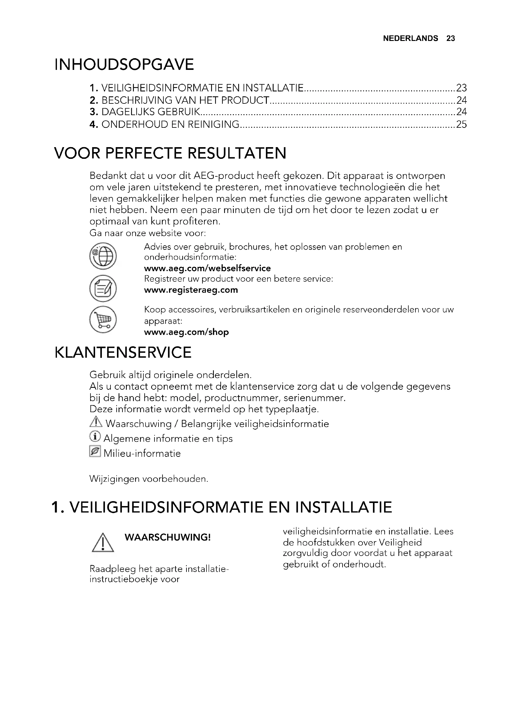 Bedankt dat u voor dit AEG-product heeft gekozen. Dit apparaat is ontworpen om vele jaren uitstekend te presteren, met innovatieve technologieën die het leven gemakkelijker helpen maken met functies die gewone apparaten wellicht niet hebben. Neem een paar minuten de tijd om het door te lezen zodat u er optimaal van kunt profiteren. Ga naar onze website voor: Advies over gebruik, brochures, het oplossen van problemen en onderhoudsinformatie: www.aeg.com/webselfservice Registreer uw product voor een betere service: www.registeraeg.com Koop accessoires, verbruiksartikelen en originele reserveonderdelen voor uw apparaat: www.aeg.com/shop KLANTENSERVICE Gebruik altijd originele onderdelen. Als u contact opneemt met de klantenservice zorg dat u de volgende gegevens bij de hand hebt: model, productnummer, serienummer. Deze informatie wordt vermeld op het typeplaatje. Waarschuwing / Belangrijke veiligheidsinformatie Algemene informatie en tips Milieu-informatie Wijzigingen voorbehouden.