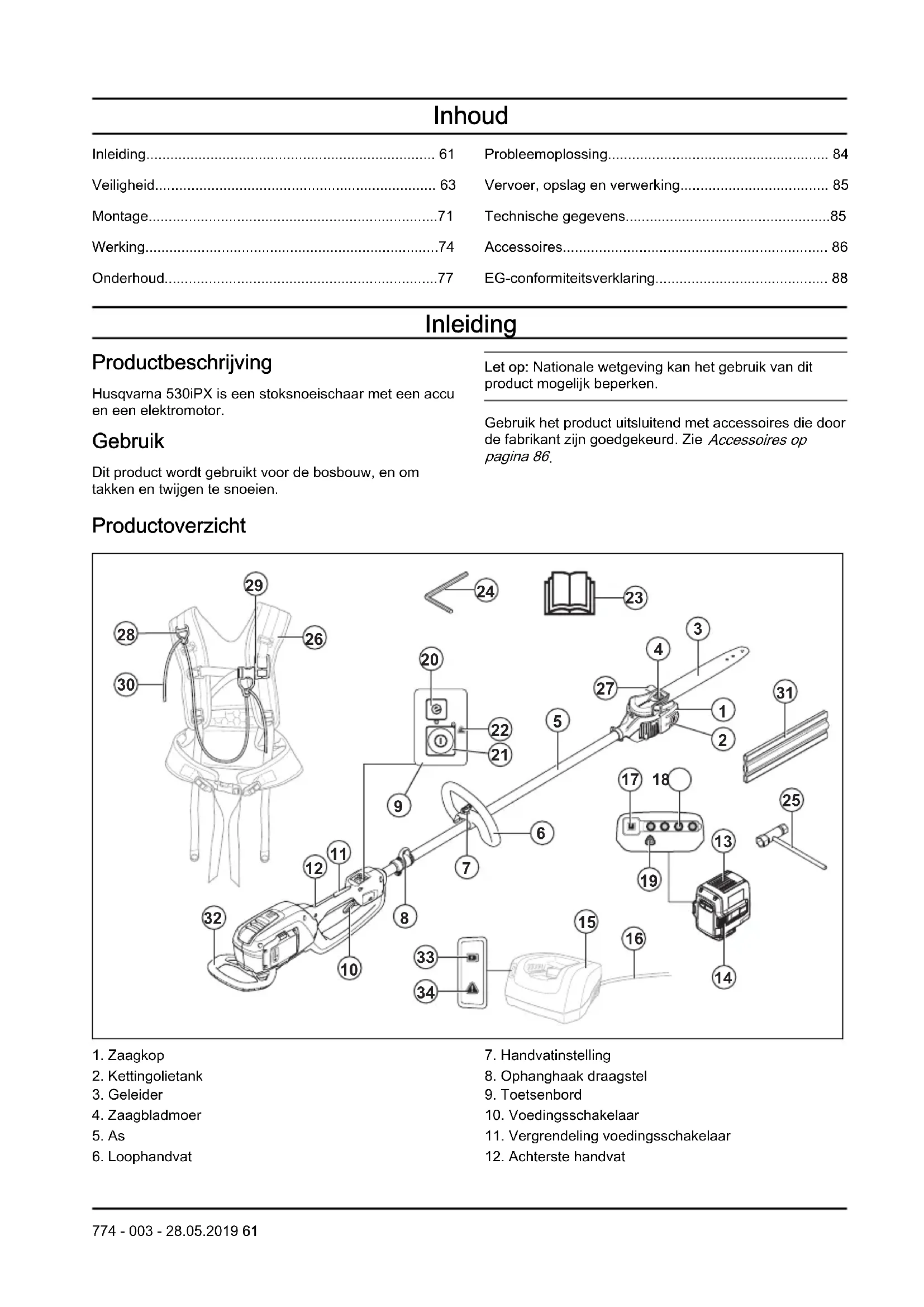 - EG-conformiteitsverklaring Inleiding Productbeschrijving Husqvarna 530iPX is een stoksnoeischaar met een accu en een elektromotor. Gebruik Dit product wordt gebruikt voor de bosbouw, en om takken en twijgen te snoeien. Let op: Nationale wetgeving kan het gebruik van dit product mogelijk beperken. Gebruik het product uitsluitend met accessoires die door de fabrikant zijn goedgekeurd. Zie Accessoires op pagina 86 p. 88