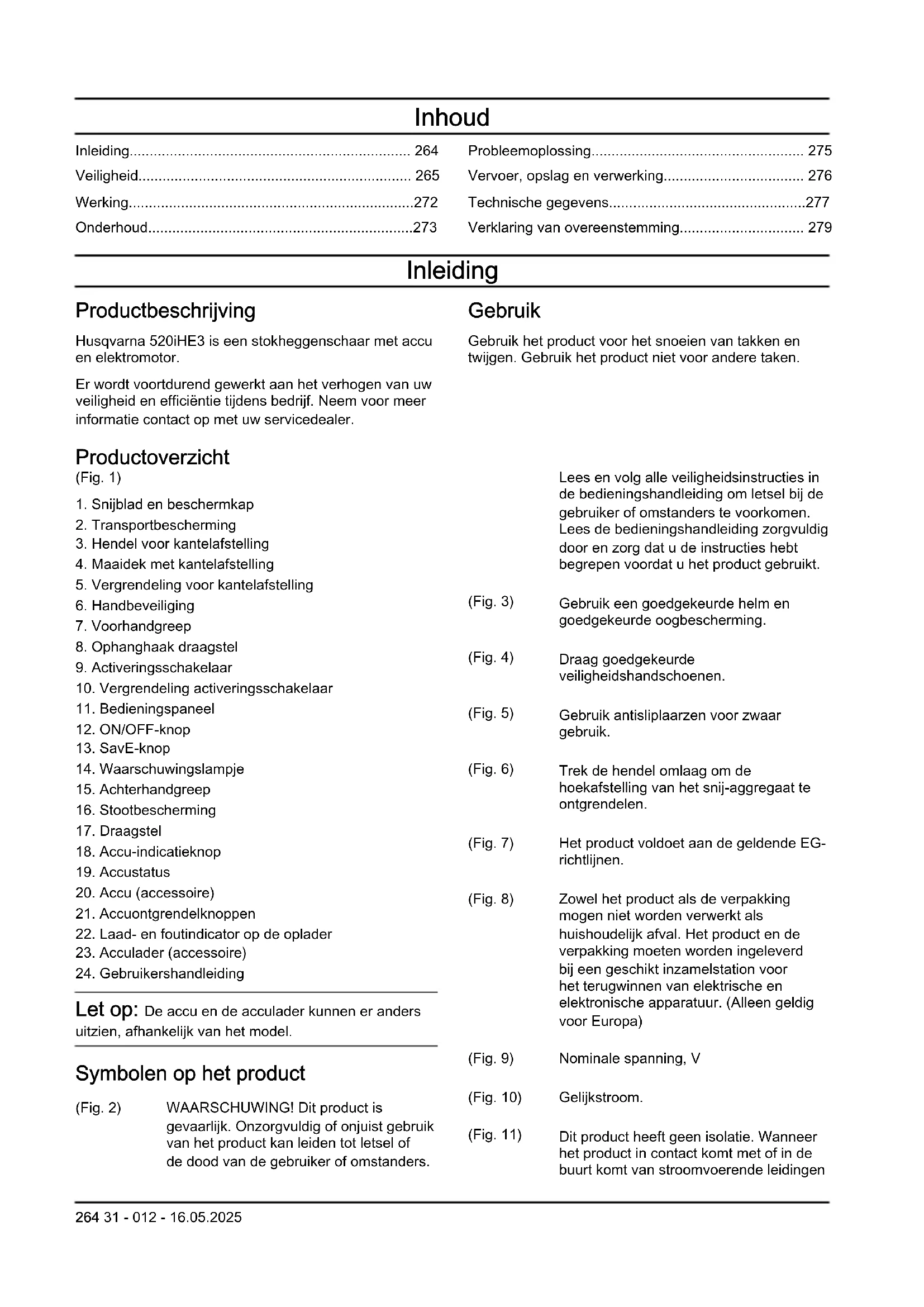 Let op: De accu en de acculader kunnen er anders uitzien, afhankelijk van het model. Symbolen op het product (Fig. 2) WAARSCHUWING! Dit product is gevaarlijk. Onzorgvuldig of onjuist gebruik van het product kan leiden tot letsel of de dood van de gebruiker of omstanders. Lees en volg alle veiligheidsinstructies in de bedieningshandleiding om letsel bij de gebruiker of omstanders te voorkomen. Lees de bedieningshandleiding zorgvuldig door en zorg dat u de instructies hebt begrepen voordat u het product gebruikt. (Fig. 3) Gebruik een goedgekeurde helm en goedgekeurde oogbescherming. (Fig. 4) Draag goedgekeurde veiligheidshandschoenen. (Fig. 5) Gebruik antisliplaarzen voor zwaar gebruik. (Fig. 6) Trek de hendel omlaag om de hoekafstelling van het snij-aggregaat te ontgrendelen. (Fig. 7) Het product voldoet aan de geldende EG- richtlijnen. (Fig. 8) Zowel het product als de verpakking mogen niet worden verwerkt als huishoudelijk afval. Het product en de verpakking moeten worden ingeleverd bij een geschikt inzamelstation voor het terugwinnen van elektrische en elektronische apparatuur. (Alleen geldig voor Europa) (Fig. 9) Nominale spanning, V (Fig. 10) Gelijkstroom. (Fig. 11) Dit product heeft geen isolatie. Wanneer het product in contact komt met of in de buurt komt van stroomvoerende leidingen 264 31 - 012 - 16.05.2025kan dit leiden tot dodelijke ongelukken of ernstig letsel. Elektriciteit kan door vonkoverslag van het ene naar het andere punt overslaan. Hoe hoger de spanning, hoe groter de afstand is die de elektriciteit kan overbruggen. Elektriciteit kan ook door takken of andere voorwerpen lopen, vooral als deze nat zijn. Houd altijd minimaal 10 m afstand tussen het product en een leiding waarop spanning staat en/of voorwerpen die daarmee in contact staan. Wanneer u toch met een kortere veiligheidsafstand moet werken, moet u altijd contact opnemen met de desbetreffende energiemaatschappij om ervoor te zorgen dat de spanning uit staat voordat u uw werkzaamheden begint. Houd tijdens de werkzaamheden minimaal 15 m afstand tot andere personen of dieren. (Fig. 12) Beschermd tegen spatwater. (Fig. 13) Werkcyclus zaageenheid, bedrijfstijd/ stationaire tijd. yyyywwxxxx Het serienummer staat op het product- plaatje. yyyy is het productiejaar, ww is de productieweek en xxxx is het serie- nummer. Let op: Andere symbolen/stickers op het product hebben betrekking op certificeringseisen voor bepaalde markten. Symbolen op de accu en/of op de accuhouder. (Fig. 17) Lever dit product in bij een re- cyclepunt voor elektrische en elektronische apparatuur. (Al- leen geldig voor Europa) (Fig. 14) Faalveilige transformator. (Fig. 15) Bewaar en gebruik de acculader alleen binnen. (Fig. 16) Dubbele isolatie. Schade aan het product We zijn niet verantwoordelijk voor schade aan ons product als: