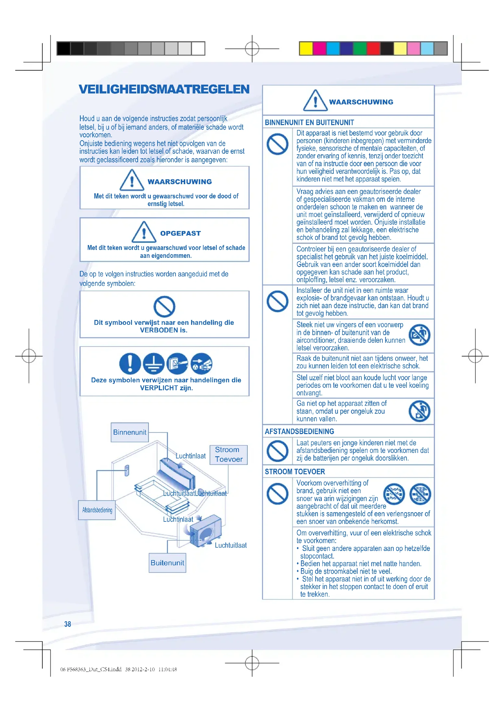- Stel het apparaat niet in of uit werking door de stekker in het stoppen contact te doen of eruit te trekken. Luchtinlaat Luchtuitlaat Luchtinlaat Afstandsbediening Stroom Toevoer Binnenunit Buitenunit LuchtuitlaatLuchtuitlaat 06 F568363_Dut_CS4.indd 38 2012-2-10 11:04:48NEDERLANDS
