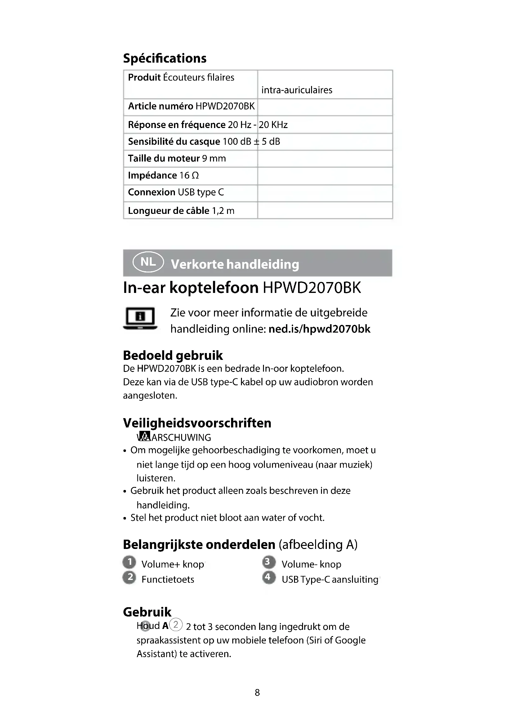 Verkorte handleiding In-ear koptelefoon HPWD2070BK Zie voor meer informatie de uitgebreide handleiding online: ned.is/hpwd2070bk Bedoeld gebruik De HPWD2070BK is een bedrade In-oor koptelefoon.Deze kan via de USB type-C kabel op uw audiobron worden aangesloten. Veiligheidsvoorschriften