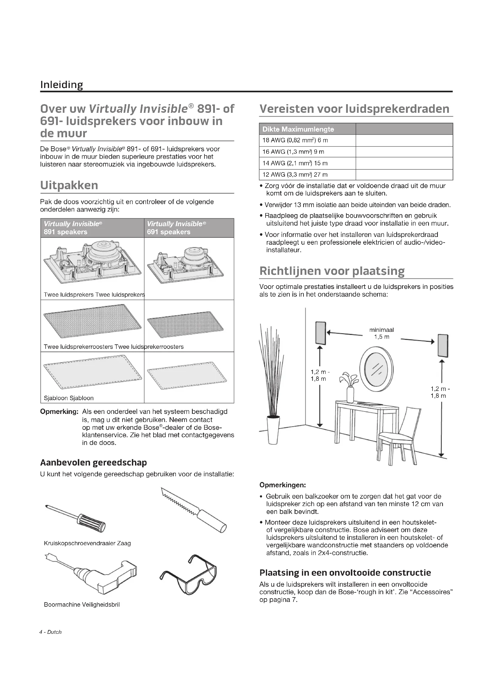 -dealer of de Bose- klantenservice. Zie het blad met contactgegevens in de doos. Aanbevolen gereedschap U kunt het volgende gereedschap gebruiken voor de installatie: Kruiskopschroevendraaier ZaagBoormachine Veiligheidsbril Vereisten voor luidsprekerdraden Dikte Maximumlengte 18 AWG (0,82 mm ) 6 m16 AWG (1,3 mm ) 9 m14 AWG (2,1 mm ) 15 m12 AWG (3,3 mm ) 27 m