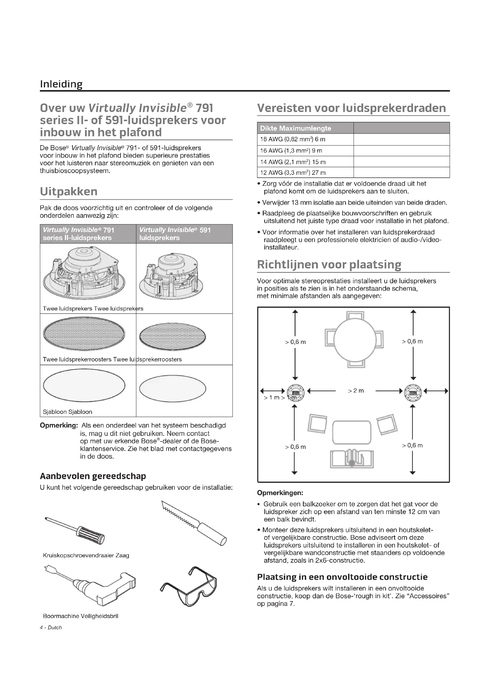 -dealer of de Bose- klantenservice. Zie het blad met contactgegevens in de doos. Aanbevolen gereedschap U kunt het volgende gereedschap gebruiken voor de installatie: Kruiskopschroevendraaier ZaagBoormachine Veiligheidsbril Vereisten voor luidsprekerdraden Dikte Maximumlengte 18 AWG (0,82 mm ) 6 m16 AWG (1,3 mm ) 9 m14 AWG (2,1 mm ) 15 m12 AWG (3,3 mm ) 27 m