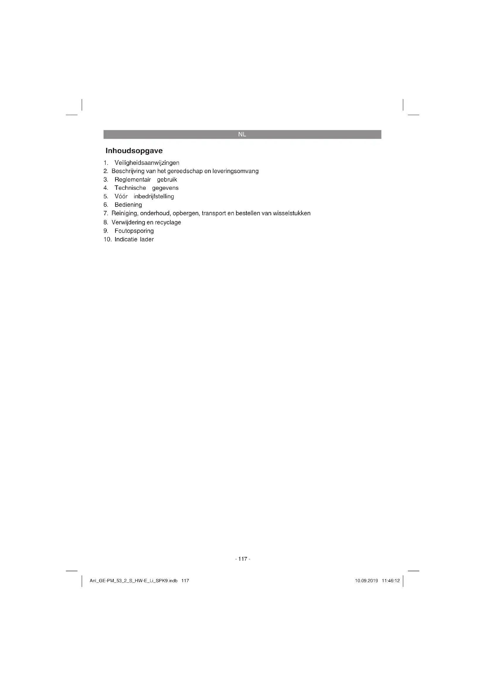 Enkel voor EU-landen Elektrisch gereedschap hoort niet bij het huisvuil thuis! Volgens de Europese richtlijn 2012/19/EG op afgedankte elektrische en elektronische toestellen en omzetting in nationaal recht dienen afgedankte elektrische gereedschappen afzonderlijk te worden ver- zameld en milieuvriendelijk te worden gerecycleerd. Recyclagealternatief i.p.v. het toestel terug te sturen: De eigenaar van het elektrische toestel is alternatief verplicht, i.p.v. het toestel terug te sturen, mede te werken bij de behoorlijke recyclage in geval hij zich van het eigendom ontdoet. Het afgedankte toestel kan hiervoor ook bij een verzamelplaats worden afgegeven die voor een verwijdering als bedoeld in de wetgeving in zake recyclage en afvalverwerking zorgt. Hieronder vallen niet bij de afgedankte toestellen gevoegde accessoires en hulpmiddelen zonder elektrische componenten. Nadruk of andere reproductie van documentatie en geleidepapieren van de producten, geheel of ge- deeltelijk, enkel toegestaan mits uitdrukkelijke toestemming van iSC GmbH. Technische wijzigingen voorbehouden Anl_GE-PM_53_2_S_HW-E_Li_SPK9.indb 129Anl_GE-PM_53_2_S_HW-E_Li_SPK9.indb 129 10.09.2019 11:46:1310.09.2019 11:46:13NL