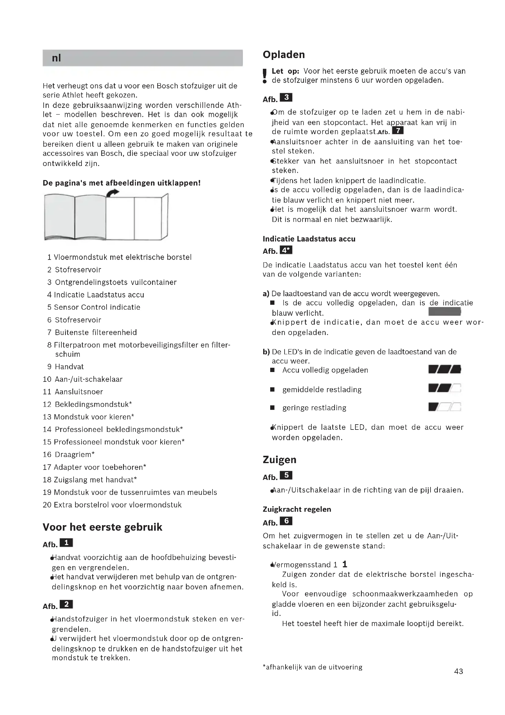 Het verheugt ons dat u voor een Bosch stofzuiger uit de serie Athlet heeft gekozen. In deze gebruiksaanwijzing worden verschillende Ath- let – modellen beschreven. Het is dan ook mogelijk dat niet alle genoemde kenmerken en functies gelden voor uw toestel. Om een zo goed mogelijk resultaat te bereiken dient u alleen gebruik te maken van originele accessoires van Bosch, die speciaal voor uw stofzuiger ontwikkeld zijn. De pagina's met afbeeldingen uitklappen! 1 Vloermondstuk met elektrische borstel 2 Stofreservoir 3 Ontgrendelingstoets vuilcontainer 4 Indicatie Laadstatus accu 5 Sensor Control indicatie 6 Stofreservoir 7 Buitenste filtereenheid 8 Filterpatroon met motorbeveiligingsfilter en filter- schuim 9 Handvat 10 Aan-/uit-schakelaar 11 Aansluitsnoer 12 Bekledingsmondstuk* 13 Mondstuk voor kieren* 14 Professioneel bekledingsmondstuk* 15 Professioneel mondstuk voor kieren* 16 Draagriem* 17 Adapter voor toebehoren* 18 Zuigslang met handvat* 19 Mondstuk voor de tussenruimtes van meubels 20 Extra borstelrol voor vloermondstuk Voor het eerste gebruik Afb.