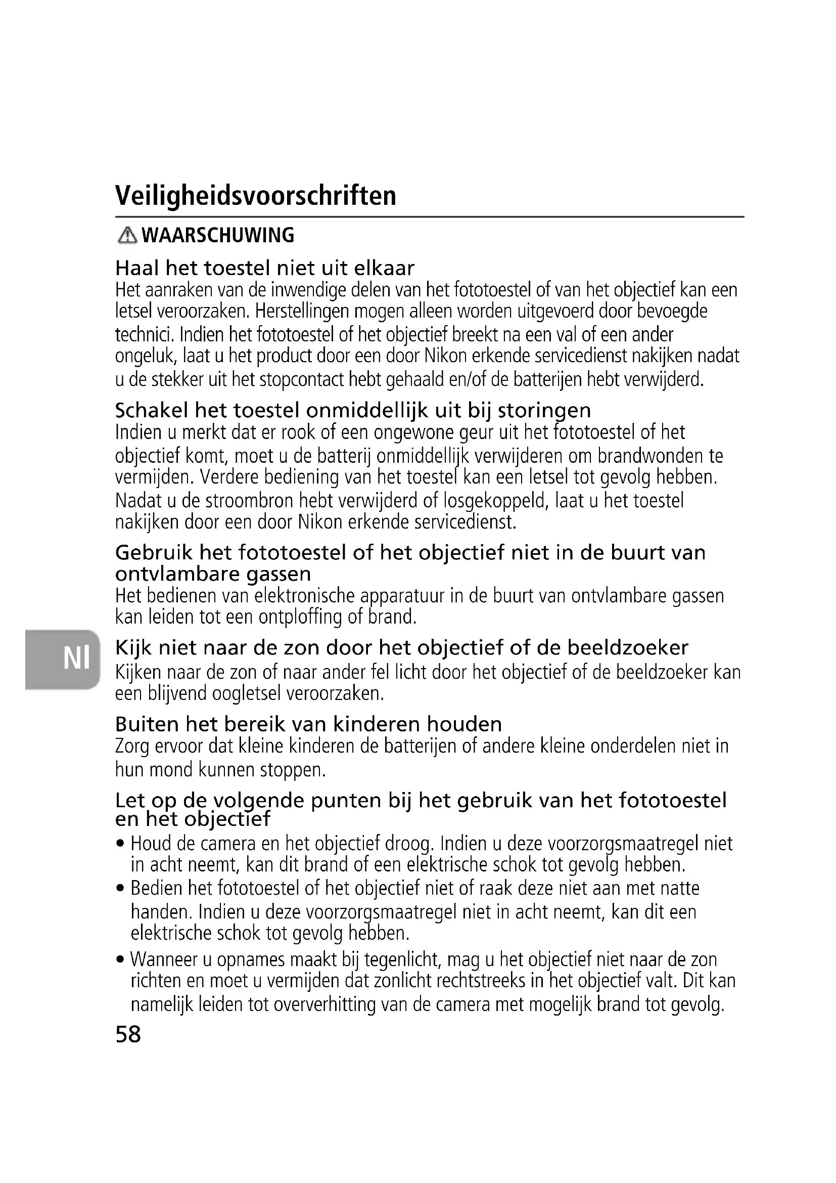 Nl-20 Veiligheidsvoorschriften WAARSCHUWING Haal het toestel niet uit elkaar Het aanraken van de inwendige delen van het fototoestel of van het objectief kan een letsel veroorzaken. Herstellingen mogen alleen worden uitgevoerd door bevoegde technici. Indien het fototoestel of het objectief breekt na een val of een ander ongeluk, laat u het product door een door Nikon erkende servicedienst nakijken nadat u de stekker uit het stopcontact hebt gehaald en/of de batterijen hebt verwijderd. Schakel het toestel onmiddellijk uit bij storingen Indien u merkt dat er rook of een ongewone geur uit het fototoestel of het objectief komt, moet u de batterij onmiddellijk verwijderen om brandwonden te vermijden. Verdere bediening van het toestel kan een letsel tot gevolg hebben. Nadat u de stroombron hebt verwijderd of losgekoppeld, laat u het toestel nakijken door een door Nikon erkende servicedienst. Gebruik het fototoestel of het objectief niet in de buurt van ontvlambare gassen Het bedienen van elektronische apparatuur in de buurt van ontvlambare gassen kan leiden tot een ontploffing of brand. Kijk niet naar de zon door het objectief of de beeldzoeker Kijken naar de zon of naar ander fel licht door het objectief of de beeldzoeker kan een blijvend oogletsel veroorzaken. Buiten het bereik van kinderen houden Zorg ervoor dat kleine kinderen de batterijen of andere kleine onderdelen niet in hun mond kunnen stoppen. Let op de volgende punten bij het gebruik van het fototoestel en het objectief