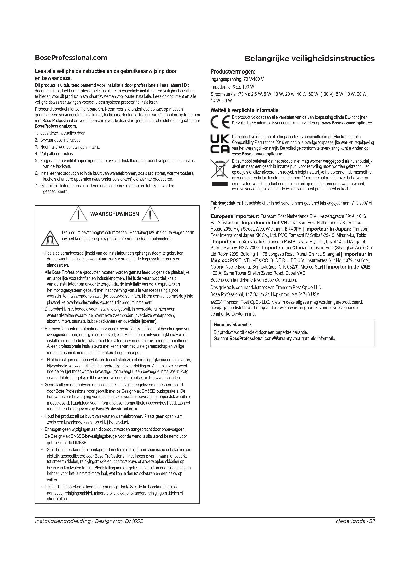 Europese importeur: Transom Post Netherlands B.V., Keizersgracht 391A, 1016 EJ, Amsterdam | Importeur in het VK: Transom Post Netherlands UK, Squires House 205a High Street, West Wickham, BR4 0PH | Importeur in Japan: Transom Post International Japan KK Co., Ltd. PMO Tamachi IV Shiba5-29-19, Minato-ku, Tokio | Importeur in Australië: Transom Post Australia Pty. Ltd., Level 14, 60 Margaret Street, Sydney, NSW 2000 | Importeur in China: Transom Post (Shanghai) Audio Co. Ltd Room 2209, Building 1, 175 Longyao Road, Xuhui District, Shanghai | Importeur in Mexico: POST INTL MEXICO, S. DE R.L. DE C.V. Insurgentes Sur No. 1079, 1st oor, Colonia Noche Buena, Benito Juárez, C.P. 03270, Mexico-Stad | Importer in de VAE: 102 A, Sama Tower Sheikh Zayed Road, Dubai VAE Bose is een handelsmerk van Bose Corporation. DesignMax is een handelsmerk van Transom Post OpCo LLC. Bose Professional, 117 South St, Hopkinton, MA 01748 USA ©2024 Transom Post OpCo LLC. Niets in deze uitgave mag worden gereproduceerd, gewijzigd, gedistribueerd of op andere wijze worden gebruikt zonder voorafgaande schriftelijke toestemming. Garantie-informatie Dit product wordt gedekt door een beperkte garantie. Ga naar BoseProfessional.com/Warranty voor garantie-informatie.38 • Nederlands DesignMax DM6SE • Installatiehandleiding BoseProfessional.com Overzicht Inhoud van de doos Afmetingen van het product × 2 × 2 × 2 × 2267 mm210 mm222 mm223 mm229 mm245 mm340 mm Technische specificaties Raadpleeg voor aanvullende specificaties het datasheet met technische gegevens voor de DesignMax DM6SE op BoseProfessional.com.FysiekAfmetingen van het product Hoogte: 340 mmBreedte: 222 mmDiepte: 229 mmNettogewicht, luidspreker met grille en beugel (enkel)6,40 kgVerzendgewicht (paar) 14,74 kg Belangrijke installatie-informatie Lees voordat u de luidspreker installeert Belangrijke veiligheidsinstructies op pagina 37.Ø 5,5 mmNederlands • 39Installatiehandleiding • DesignMax DM6SE BoseProfessional.com Installatie Installatieopties Installatieopties en -accessoires q Montagebeugel (meegeleverd) w Surface-Mount Pan and Tilt Bracket (optioneel) CMBS2-plafondbeugel (optioneel; alleen voor binnengebruik) Pole Mount Bracket (optioneel) q w De weerbestendige afdekking voorbereiden De weerbestendige afdekking is geschikt voor drie verschillende bedradingsschema’s (zie boven). Om de configuratie van de afdekking aan te passen aan uw bedradingsschema, knipt u langs de perforatie op de rubberen geleiding.Opmerking: Bij gebruik binnen hoeft de afdekking niet te worden gebruikt.Enkel inIn en uit Volledig openOpmerking: Bij de volledig open-configuratie is het de verantwoordelijkheid van de installateur om voor afdichting te zorgen die het binnendringen van water in de Euroblock-connector voorkomt.Opmerking: Als de luidspreker met de rubberen geleiding omhoog gericht wordt gemonteerd, is het de verantwoordelijkheid van de installateur om voor afdichting te zorgen die het binnendringen van water in de Euroblock-connector voorkomt. 40 • Nederlands DesignMax DM6SE • Installatiehandleiding BoseProfessional.com Installatie De luidspreker bekabelen Bekabelingsdiameter De DesignMax DM6SE loudspeaker is uitsluitend ontworpen voor bedrading van 18 AWG (0,8 mm ) tot 14 AWG (2,1mm