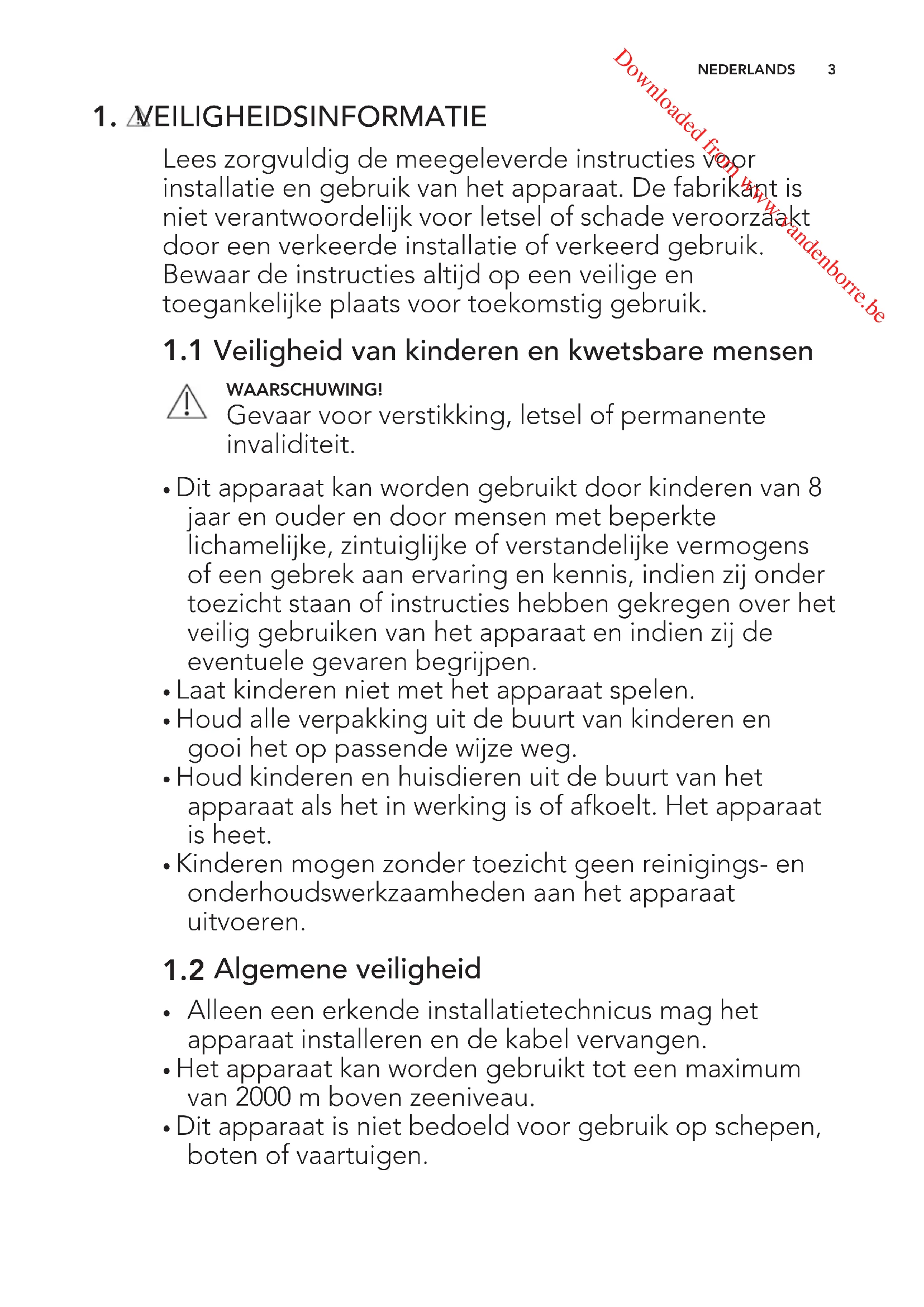 Downloaded from www.vandenborre.be1. VEILIGHEIDSINFORMATIE Lees zorgvuldig de meegeleverde instructies voor installatie en gebruik van het apparaat. De fabrikant is niet verantwoordelijk voor letsel of schade veroorzaakt door een verkeerde installatie of verkeerd gebruik. Bewaar de instructies altijd op een veilige en toegankelijke plaats voor toekomstig gebruik.