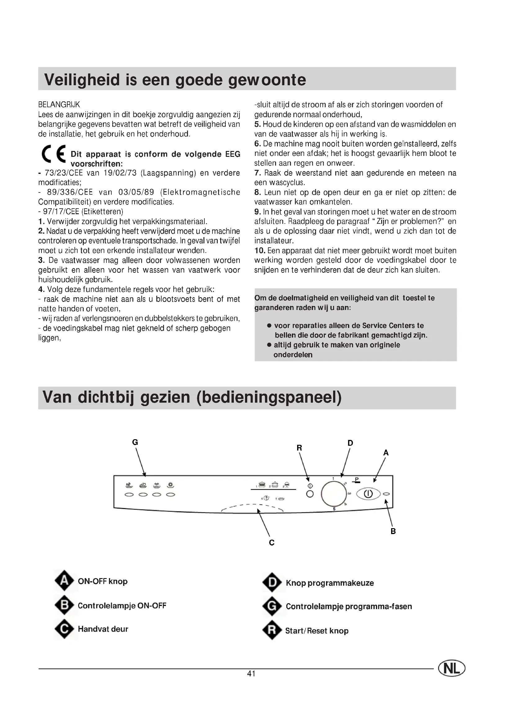 - raak de machine niet aan als u blootsvoets bent of met natte handen of voeten, - wij raden af verlengsnoeren en dubbelstekkers te gebruiken, - de voedingskabel mag niet gekneld of scherp gebogen liggen, Van dichtbij gezien (bedieningspaneel) -sluit altijd de stroom af als er zich storingen voorden of gedurende normaal onderhoud,