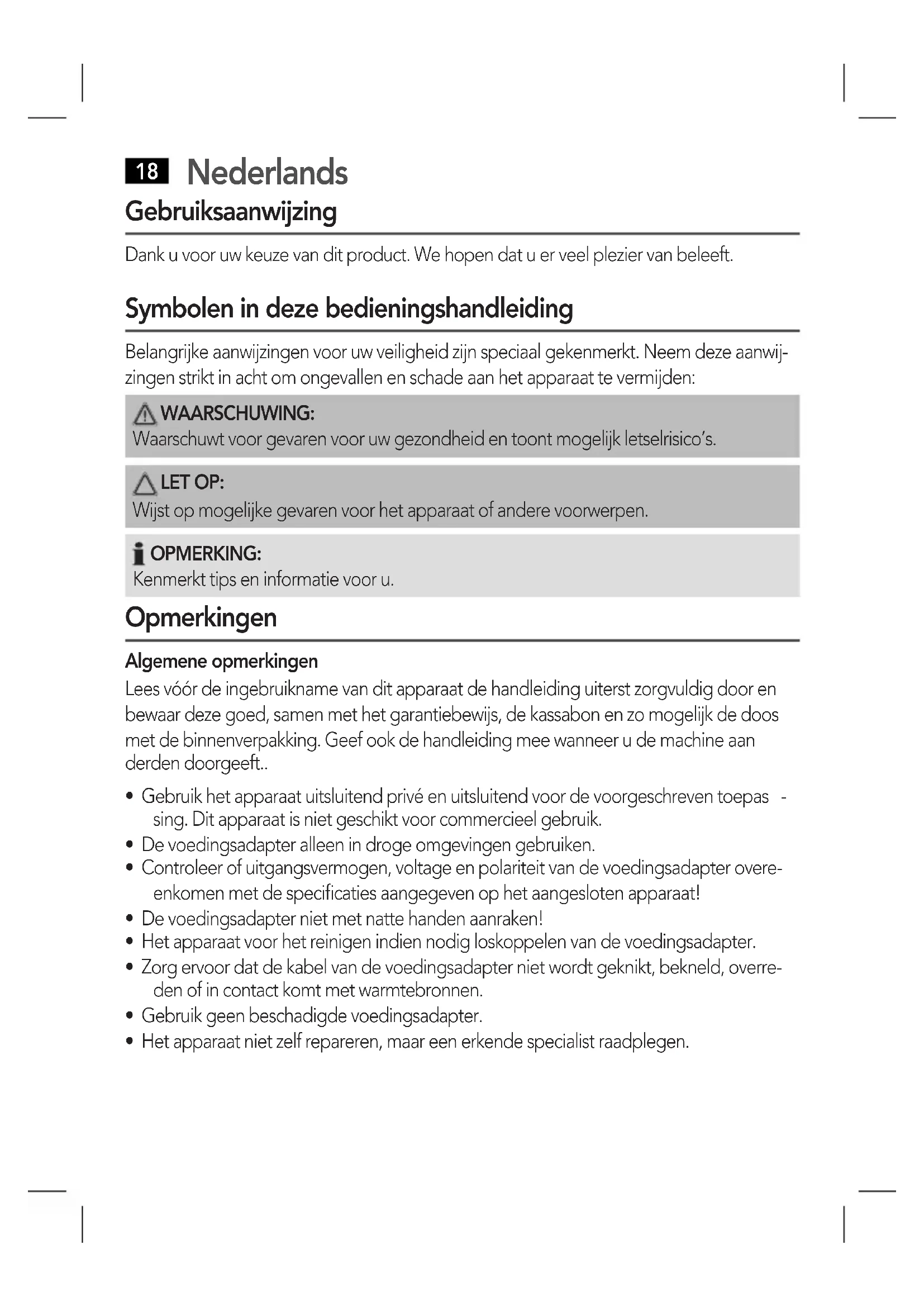 Gebruiksaanwijzing Dank u voor uw keuze van dit product. We hopen dat u er veel plezier van beleeft. Symbolen in deze bedieningshandleiding Belangrijke aanwijzingen voor uw veiligheid zijn speciaal gekenmerkt. Neem deze aanwij- zingen strikt in acht om ongevallen en schade aan het apparaat te vermijden: WAARSCHUWING: Waarschuwt voor gevaren voor uw gezondheid en toont mogelijk letselrisico’s. LET OP: Wijst op mogelijke gevaren voor het apparaat of andere voorwerpen. OPMERKING: Kenmerkt tips en informatie voor u. Opmerkingen Algemene opmerkingen Lees vóór de ingebruikname van dit apparaat de handleiding uiterst zorgvuldig door en bewaar deze goed, samen met het garantiebewijs, de kassabon en zo mogelijk de doos met de binnenverpakking. Geef ook de handleiding mee wanneer u de machine aan derden doorgeeft..