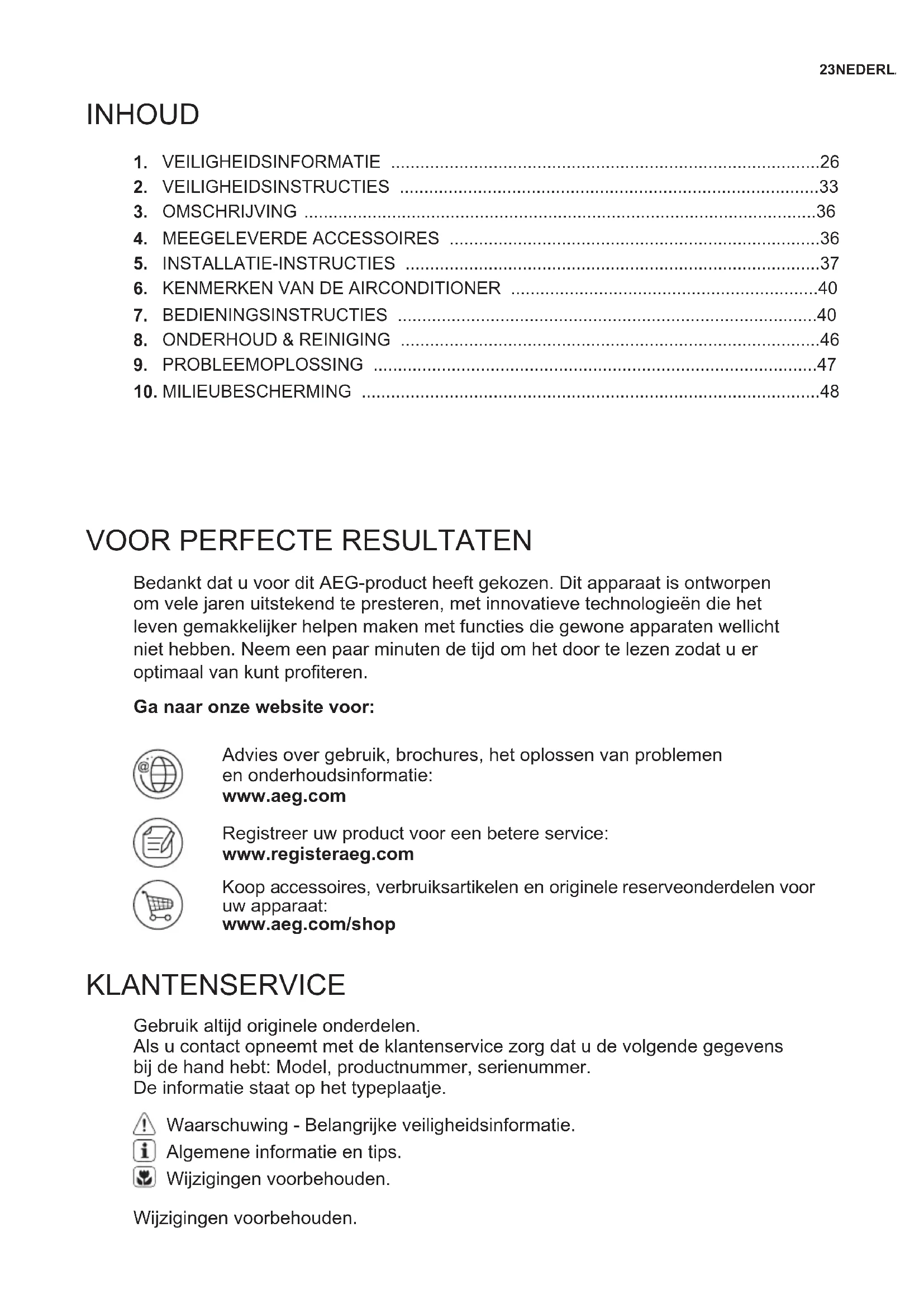 KLANTENSERVICE Bedankt dat u voor dit AEG-product heeft gekozen. Dit apparaat is ontworpen om vele jaren uitstekend te presteren, met innovatieve technologieën die het leven gemakkelijker helpen maken met functies die gewone apparaten wellicht niet hebben. Neem een paar minuten de tijd om het door te lezen zodat u er optimaal van kunt profiteren. Gebruik altijd originele onderdelen. Als u contact opneemt met de klantenservice zorg dat u de volgende gegevens bij de hand hebt: Model, productnummer, serienummer. De informatie staat op het typeplaatje. Ga naar onze website voor: Advies over gebruik, brochures, het oplossen van problemen en onderhoudsinformatie: www.aeg.com Registreer uw product voor een betere service: www.registeraeg.com Koop accessoires, verbruiksartikelen en originele reserveonderdelen voor uw apparaat: www.aeg.com/shop Wijzigingen voorbehouden. Waarschuwing - Belangrijke veiligheidsinformatie. Algemene informatie en tips. Wijzigingen voorbehouden.24 www.aeg.com