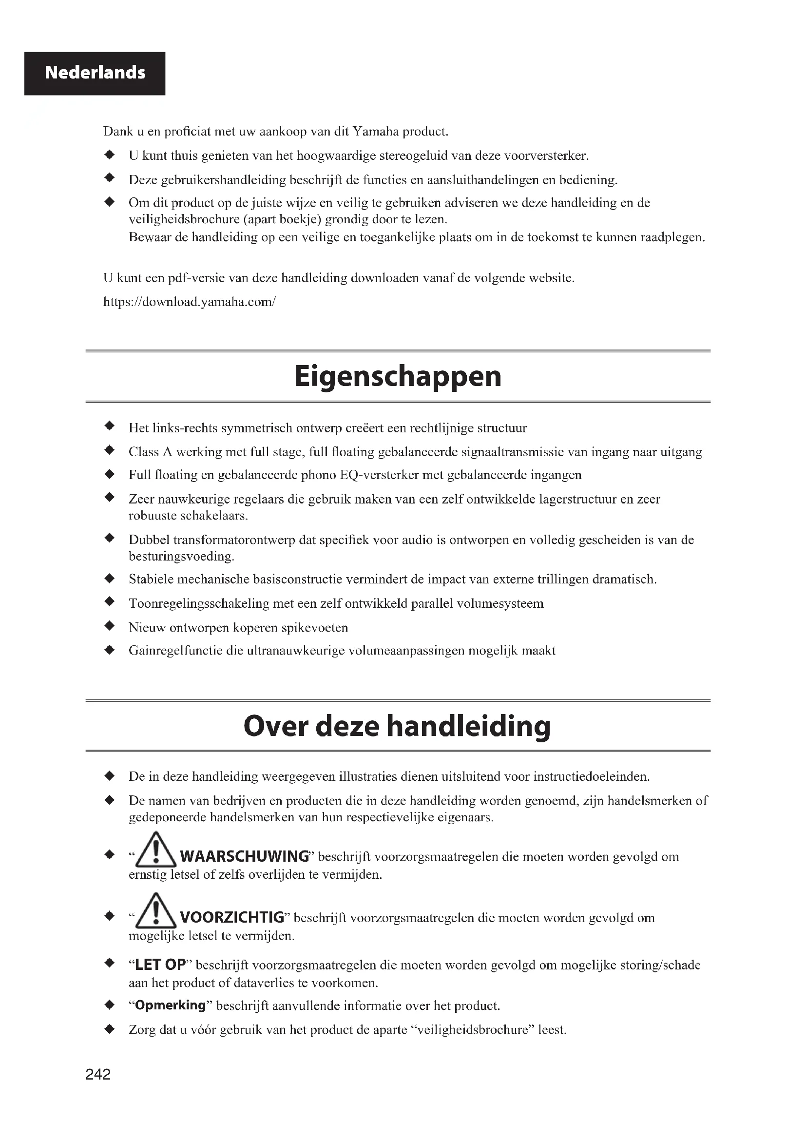 Om dit product op de juiste wijze en veilig te gebruiken adviseren we deze handleiding en de veiligheidsbrochure (apart boekje) grondig door te lezen. Bewaar de handleiding op een veilige en toegankelijke plaats om in de toekomst te kunnen raadplegen. U kunt een pdf-versie van deze handleiding downloaden vanaf de volgende website. https://download.yamaha.com/ Eigenschappen