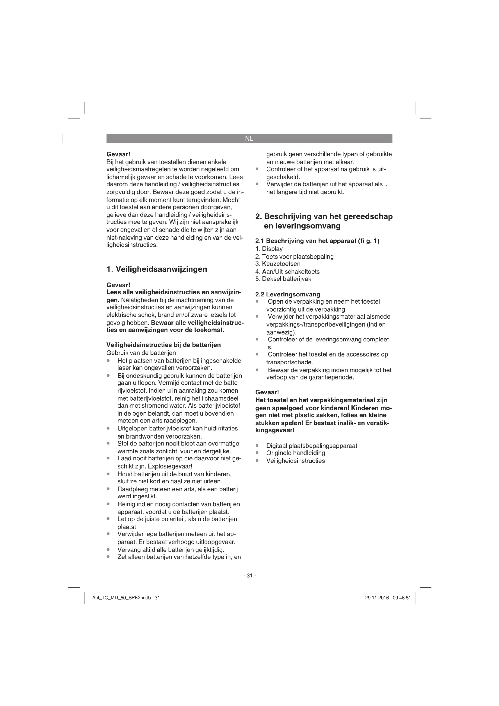 Gevaar! Bij het gebruik van toestellen dienen enkele veiligheidsmaatregelen te worden nageleefd om lichamelijk gevaar en schade te voorkomen. Lees daarom deze handleiding / veiligheidsinstructies zorgvuldig door. Bewaar deze goed zodat u de in- formatie op elk moment kunt terugvinden. Mocht u dit toestel aan andere personen doorgeven, gelieve dan deze handleiding / veiligheidsins- tructies mee te geven. Wij zijn niet aansprakelijk voor ongevallen of schade die te wijten zijn aan niet-naleving van deze handleiding en van de vei- ligheidsinstructies.