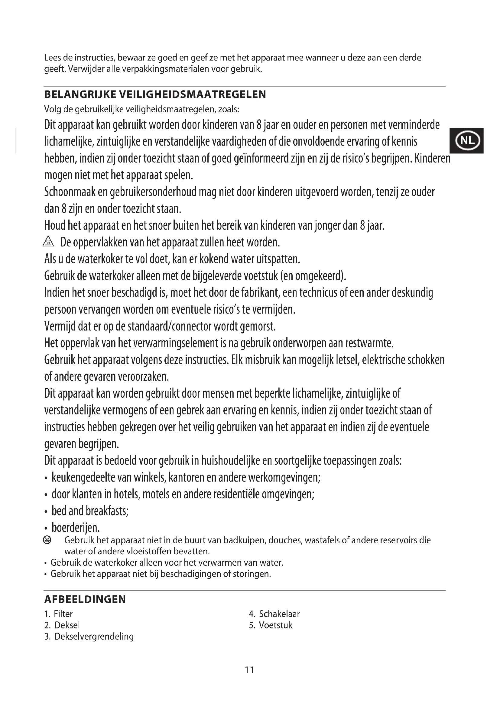 An d’éviter les problèmes occasionnés à l’environnement et à la santé par des substances dangereuses, les appareils et les batteries rechargeables et non rechargeables présentant l’un de ces symboles ne doivent pas être éliminés avec les déchets municipaux non triés. Éliminez dans tous les cas les produits électriques et électroniques et, le cas échéant, les batteries rechargeables et non rechargeables, dans un centre ociel et approprié de collecte/recyclage.11 Lees de instructies, bewaar ze goed en geef ze met het apparaat mee wanneer u deze aan een derde geeft. Verwijder alle verpakkingsmaterialen voor gebruik. BELANGRIJKE VEILIGHEIDSMAATREGELEN Volg de gebruikelijke veiligheidsmaatregelen, zoals: Dit apparaat kan gebruikt worden door kinderen van 8 jaar en ouder en personen met verminderde lichamelijke, zintuiglijke en verstandelijke vaardigheden of die onvoldoende ervaring of kennis hebben, indien zij onder toezicht staan of goed geïnformeerd zijn en zij de risico’s begrijpen. Kinderen mogen niet met het apparaat spelen. Schoonmaak en gebruikersonderhoud mag niet door kinderen uitgevoerd worden, tenzij ze ouder dan 8 zijn en onder toezicht staan. Houd het apparaat en het snoer buiten het bereik van kinderen van jonger dan 8 jaar. h De oppervlakken van het apparaat zullen heet worden. Als u de waterkoker te vol doet, kan er kokend water uitspatten. Gebruik de waterkoker alleen met de bijgeleverde voetstuk (en omgekeerd). Indien het snoer beschadigd is, moet het door de fabrikant, een technicus of een ander deskundig persoon vervangen worden om eventuele risico’s te vermijden. Vermijd dat er op de standaard/connector wordt gemorst. Het oppervlak van het verwarmingselement is na gebruik onderworpen aan restwarmte. Gebruik het apparaat volgens deze instructies. Elk misbruik kan mogelijk letsel, elektrische schokken of andere gevaren veroorzaken. Dit apparaat kan worden gebruikt door mensen met beperkte lichamelijke, zintuiglijke of verstandelijke vermogens of een gebrek aan ervaring en kennis, indien zij onder toezicht staan of instructies hebben gekregen over het veilig gebruiken van het apparaat en indien zij de eventuele gevaren begrijpen. Dit apparaat is bedoeld voor gebruik in huishoudelijke en soortgelijke toepassingen zoals: