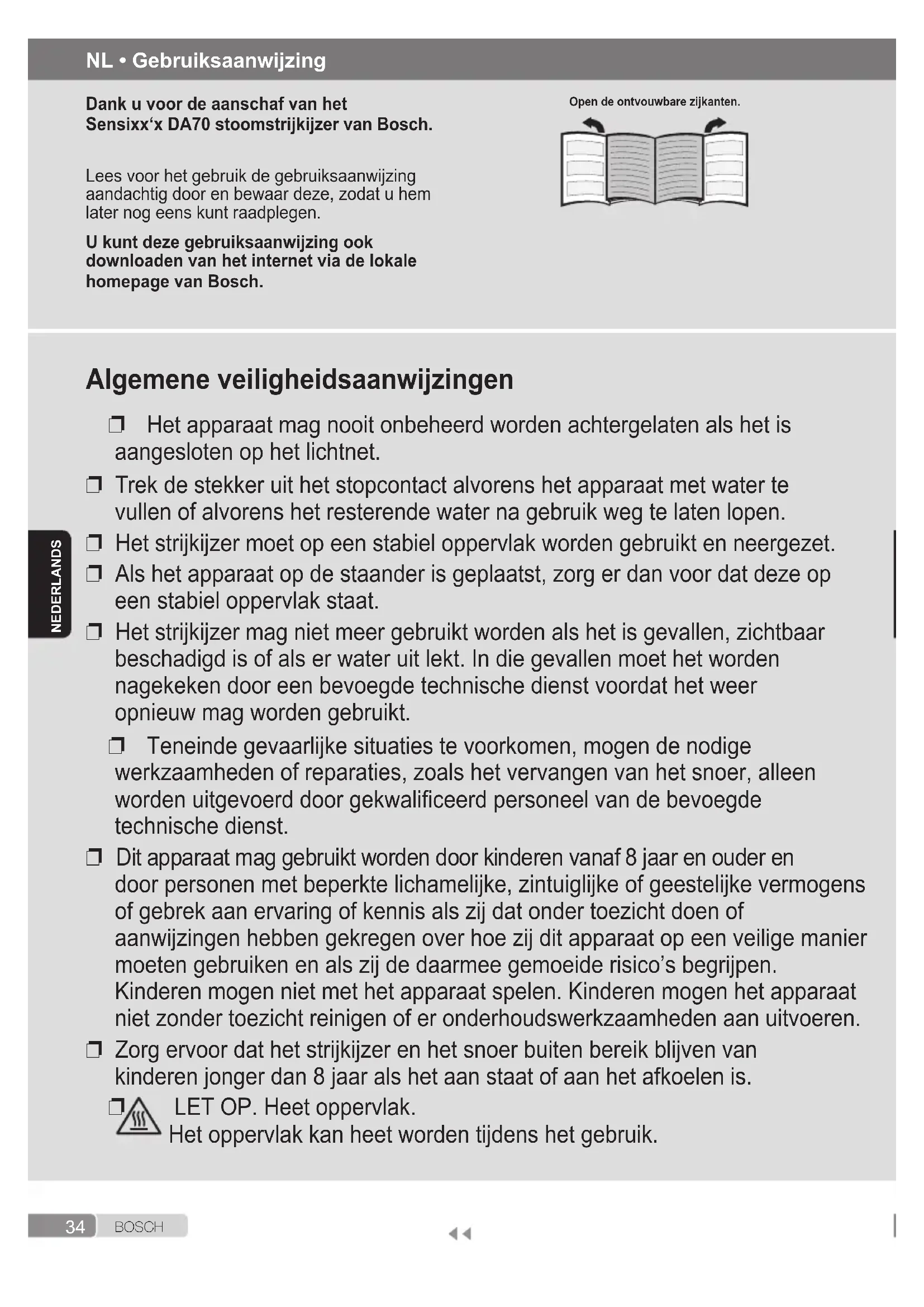 LET OP. Heet oppervlak. Het oppervlak kan heet worden tijdens het gebruik. NL • Gebruiksaanwijzing Dank u voor de aanschaf van het Sensixx‘x DA70 stoomstrijkijzer van Bosch. Lees voor het gebruik de gebruiksaanwijzing aandachtig door en bewaar deze, zodat u hem later nog eens kunt raadplegen. U kunt deze gebruiksaanwijzing ook downloaden van het internet via de lokale homepage van Bosch. Open de ontvouwbare zijkanten.35 B O S C H