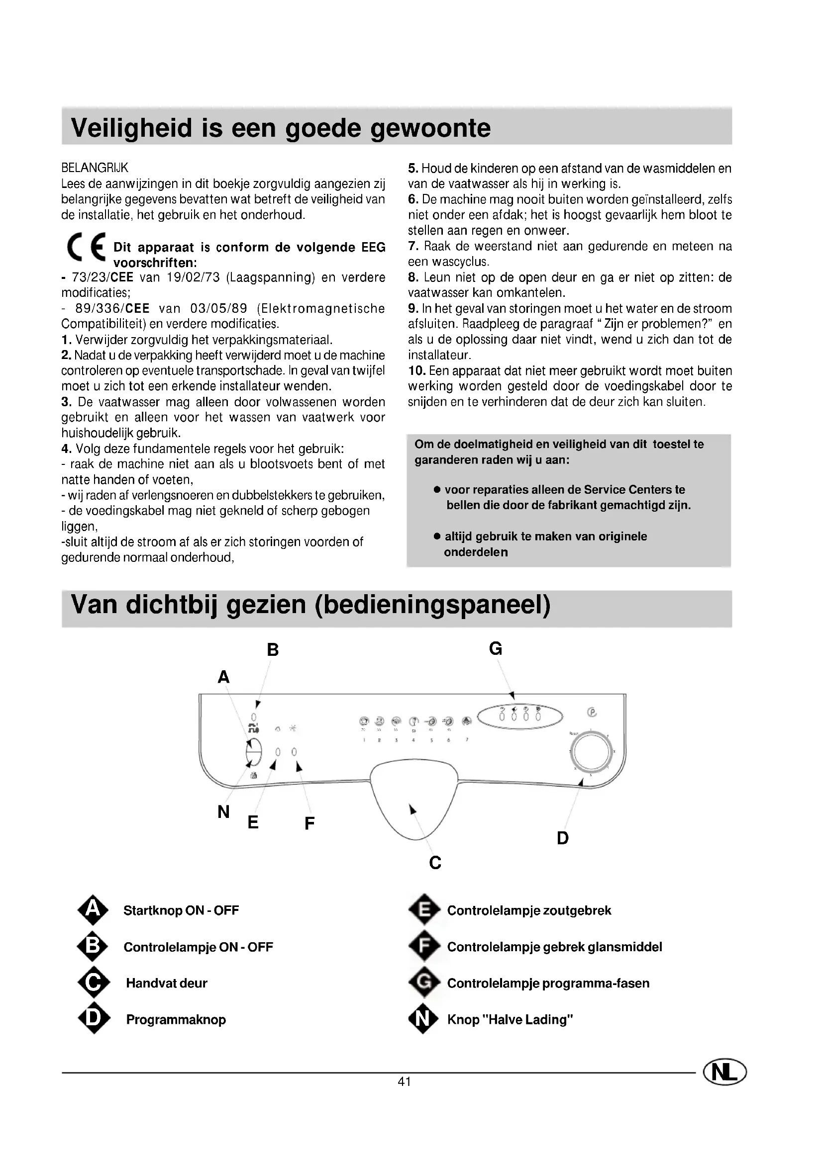 Veiligheid is een goede gewoonte BELANGRIJKLees de aanwijzingen in dit boekje zorgvuldig aangezien zijbelangrijke gegevens bevatten wat betreft de veiligheid vande installatie, het gebruik en het onderhoud.Dit apparaat is conform de volgende EEGvoorschriften: - 73/23/CEE van 19/02/73 (Laagspanning) en verdere modificaties;- 89/336/CEE van 03/05/89 (ElektromagnetischeCompatibiliteit) en verdere modificaties.1. Verwijder zorgvuldig het verpakkingsmateriaal.2. Nadat u de verpakking heeft verwijderd moet u de machinecontroleren op eventuele transportschade. In geval van twijfelmoet u zich tot een erkende installateur wenden.3. De vaatwasser mag alleen door volwassenen wordengebruikt en alleen voor het wassen van vaatwerk voorhuishoudelijk gebruik.4. Volg deze fundamentele regels voor het gebruik:- raak de machine niet aan als u blootsvoets bent of metnatte handen of voeten,- wij raden af verlengsnoeren en dubbelstekkers te gebruiken,- de voedingskabel mag niet gekneld of scherp gebogenliggen,-sluit altijd de stroom af als er zich storingen voorden ofgedurende normaal onderhoud, Van dichtbij gezien (bedieningspaneel) 5. Houd de kinderen op een afstand van de wasmiddelen envan de vaatwasser als hij in werking is.6. De machine mag nooit buiten worden geïnstalleerd, zelfsniet onder een afdak; het is hoogst gevaarlijk hem bloot testellen aan regen en onweer.7. Raak de weerstand niet aan gedurende en meteen naeen wascyclus.8. Leun niet op de open deur en ga er niet op zitten: devaatwasser kan omkantelen.9. In het geval van storingen moet u het water en de stroomafsluiten. Raadpleeg de paragraaf “Zijn er problemen?” enals u de oplossing daar niet vindt, wend u zich dan tot deinstallateur.10. Een apparaat dat niet meer gebruikt wordt moet buitenwerking worden gesteld door de voedingskabel door tesnijden en te verhinderen dat de deur zich kan sluiten. Startknop ON - OFF Controlelampje ON - OFF Handvat deur ProgrammaknopControlelampje zoutgebrekControlelampje gebrek glansmiddelControlelampje programma-fasen Knop "Halve Lading"Om de doelmatigheid en veiligheid van dit toestel tegaranderen raden wij u aan:l voor reparaties alleen de Service Centers te bellen die door de fabrikant gemachtigd zijn.l altijd gebruik te maken van originele onderdele Reset