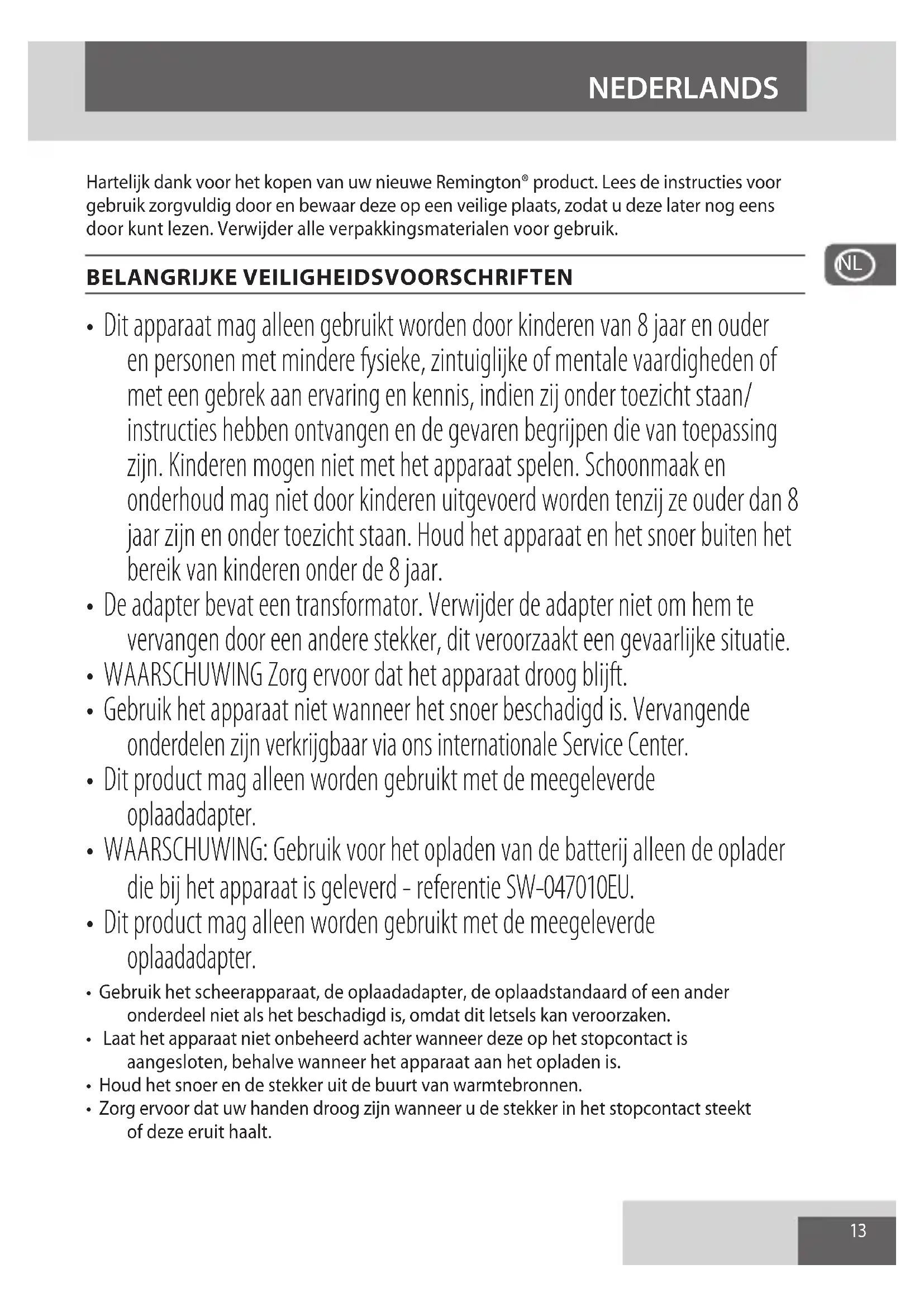 AEloading-circle-113 NEDERLANDS Hartelijk dank voor het kopen van uw nieuwe Remington® product. Lees de instructies voor gebruik zorgvuldig door en bewaar deze op een veilige plaats, zodat u deze later nog eens door kunt lezen. Verwijder alle verpakkingsmaterialen voor gebruik. BELANGRIJKE VEILIGHEIDSVOORSCHRIFTEN