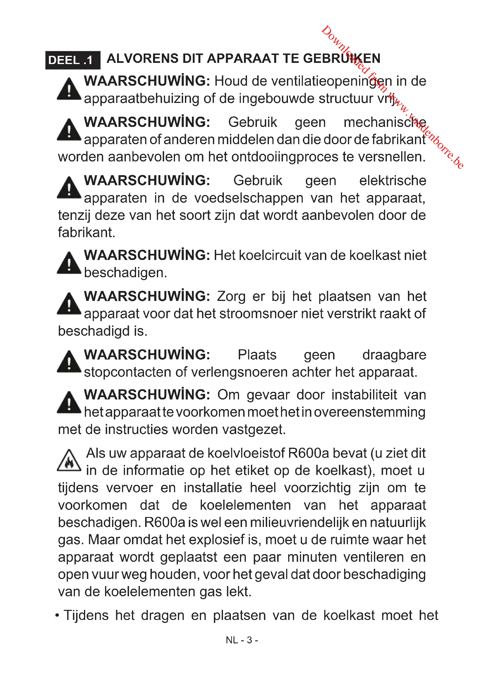 - Tijdens het dragen en plaatsen van de koelkast moet het DEEL .1 Downloaded from www.vandenborre.beNL - 4 - koelgascircuit niet beschadigd worden.