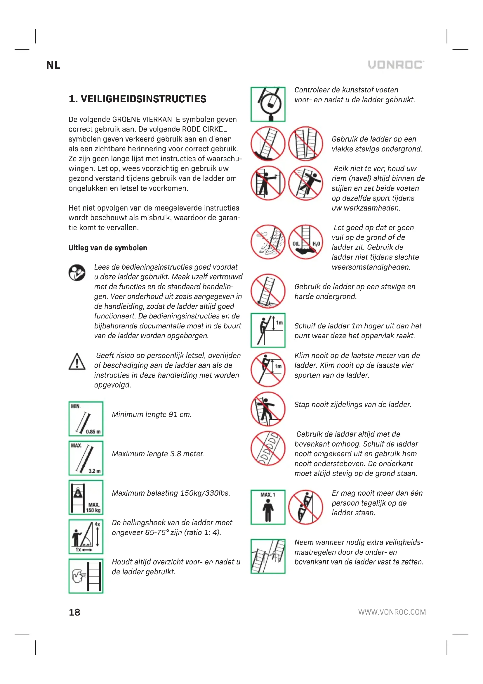 Minimum lengte 91 cm. Maximum lengte 3.8 meter. Maximum belasting 150kg/330lbs. De hellingshoek van de ladder moet ongeveer 65-75° zijn (ratio 1: 4). Houdt altijd overzicht voor- en nadat u de ladder gebruikt. Controleer de kunststof voeten voor- en nadat u de ladder gebruikt.