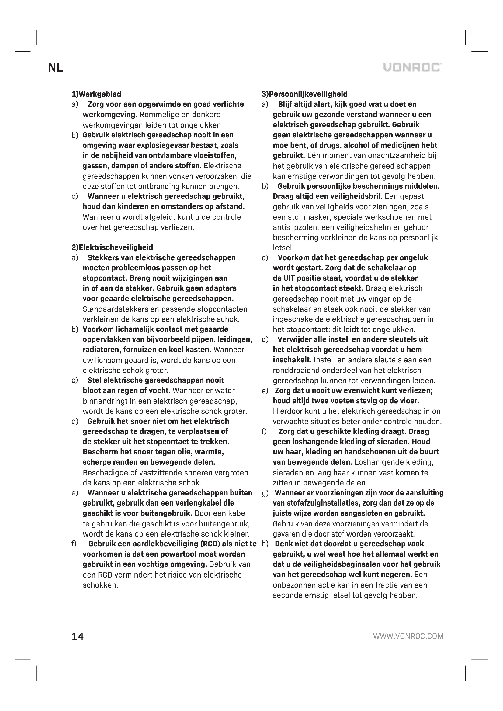 WAARSCHUWING! Lees alle veiligheids- waarschuwingen en alle instructies. Het niet opvolgen van onderstaande instructies kan leiden tot een elektrische schok, brand en/of ernstig persoonlijk letsel. Bewaar deze instructies. De term “elektrisch gereedschap” in onder staande waarschuwingen heeft betrekking op zowel apparatuur met een vaste elektriciteits kabel als op apparatuur met een accu (draadloze apparatuur).14