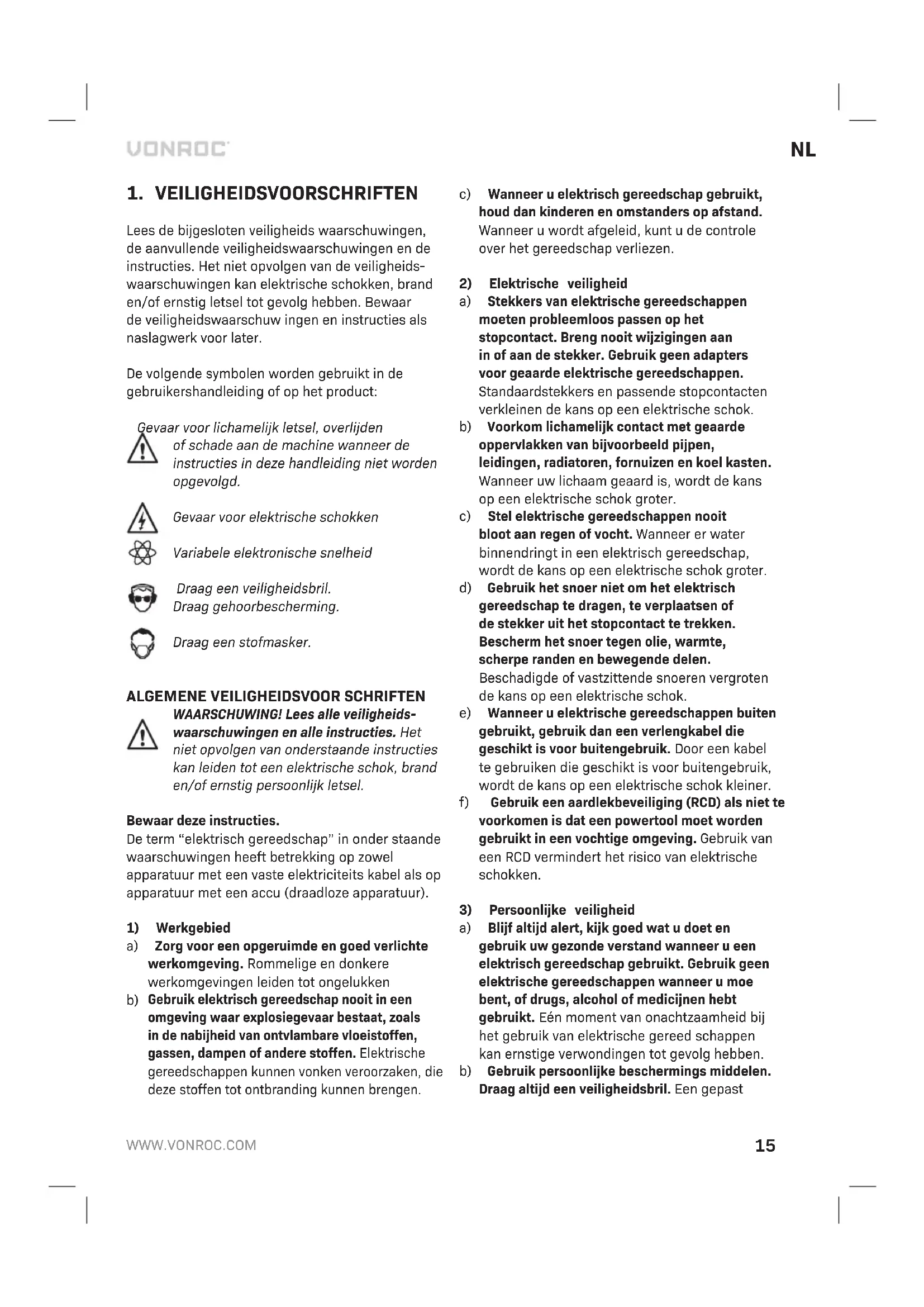 Zorg dat de machine niet onder spanning staat wanneer onderhouds werkzaam heden aan het mechaniek worden uitgevoerd. Reinig de machinebehuizing regelmatig met een zachte doek, bij voorkeur iedere keer na gebruik. Zorg dat de ventilatiesleuven vrij van stof en vuil zijn. Gebruik bij hardnekkig vuil een zachte doek bevochtigd met zeepwater. Gebruik geen oplosmid- delen als benzine, alcohol, ammonia, etc. Dergelij- ke stoffen beschadigen de kunststof onderdelen. MILIEU Defecte en/of afgedankte elektrische of elektronische gereedschappen dienen ter verwerking te worden aangeboden aan een daarvoor verantwoordelijke instantie. Uitsluitend voor EG-landen Werp elektrisch gereedschap niet weg bij het huisvuil. Conform de Europese Richtlijn 2012/19/ EG voor Afgedankte Elektrische en Elektronische Apparatuur en de implementatie ervan in nationaal recht moet niet langer te gebruiken elektrisch gereedschap gescheiden worden verzameld en op een milieuvriendelijke wijze worden verwerkt. GARANTIE VONROC producten zijn ontworpen volgens de hoogste kwaliteitsstandaarden en gegarandeerd vrij van defecten, zowel materieel als fabrieksfouten, tijdens de wettelijk vastgestelde garantieperiode vanaf de eerste aankoopdatum. Mocht het product tijdens deze periode gebreken vertonen veroorzaakt door defecte materialen en/of fabrieksfouten, neem dan rechtstreeks contact op met VONROC. De volgende situaties vallen niet onder de garantie: