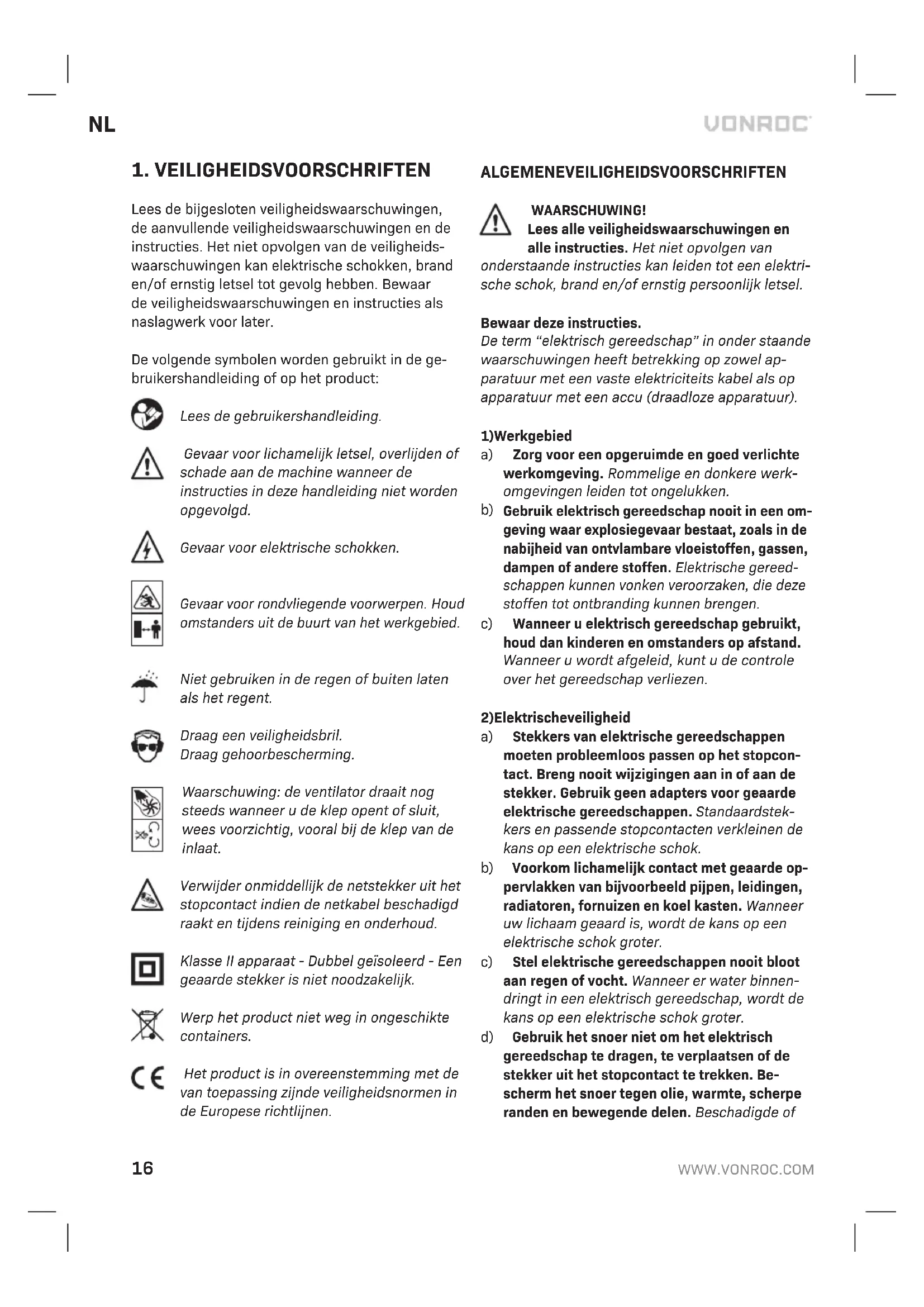 Lees de bijgesloten veiligheidswaarschuwingen, de aanvullende veiligheidswaarschuwingen en de instructies. Het niet opvolgen van de veiligheids- waarschuwingen kan elektrische schokken, brand en/of ernstig letsel tot gevolg hebben. Bewaar de veiligheidswaarschuwingen en instructies als naslagwerk voor later. De volgende symbolen worden gebruikt in de ge- bruikershandleiding of op het product: Lees de gebruikershandleiding. Gevaar voor lichamelijk letsel, overlijden of schade aan de machine wanneer de instructies in deze handleiding niet worden opgevolgd. Gevaar voor elektrische schokken. Gevaar voor rondvliegende voorwerpen. Houd omstanders uit de buurt van het werkgebied. Niet gebruiken in de regen of buiten laten als het regent. Draag een veiligheidsbril. Draag gehoorbescherming. Waarschuwing: de ventilator draait nog steeds wanneer u de klep opent of sluit, wees voorzichtig, vooral bij de klep van de inlaat. Verwijder onmiddellijk de netstekker uit het stopcontact indien de netkabel beschadigd raakt en tijdens reiniging en onderhoud. Klasse II apparaat - Dubbel geïsoleerd - Een geaarde stekker is niet noodzakelijk. Werp het product niet weg in ongeschikte containers. Het product is in overeenstemming met de van toepassing zijnde veiligheidsnormen in de Europese richtlijnen.