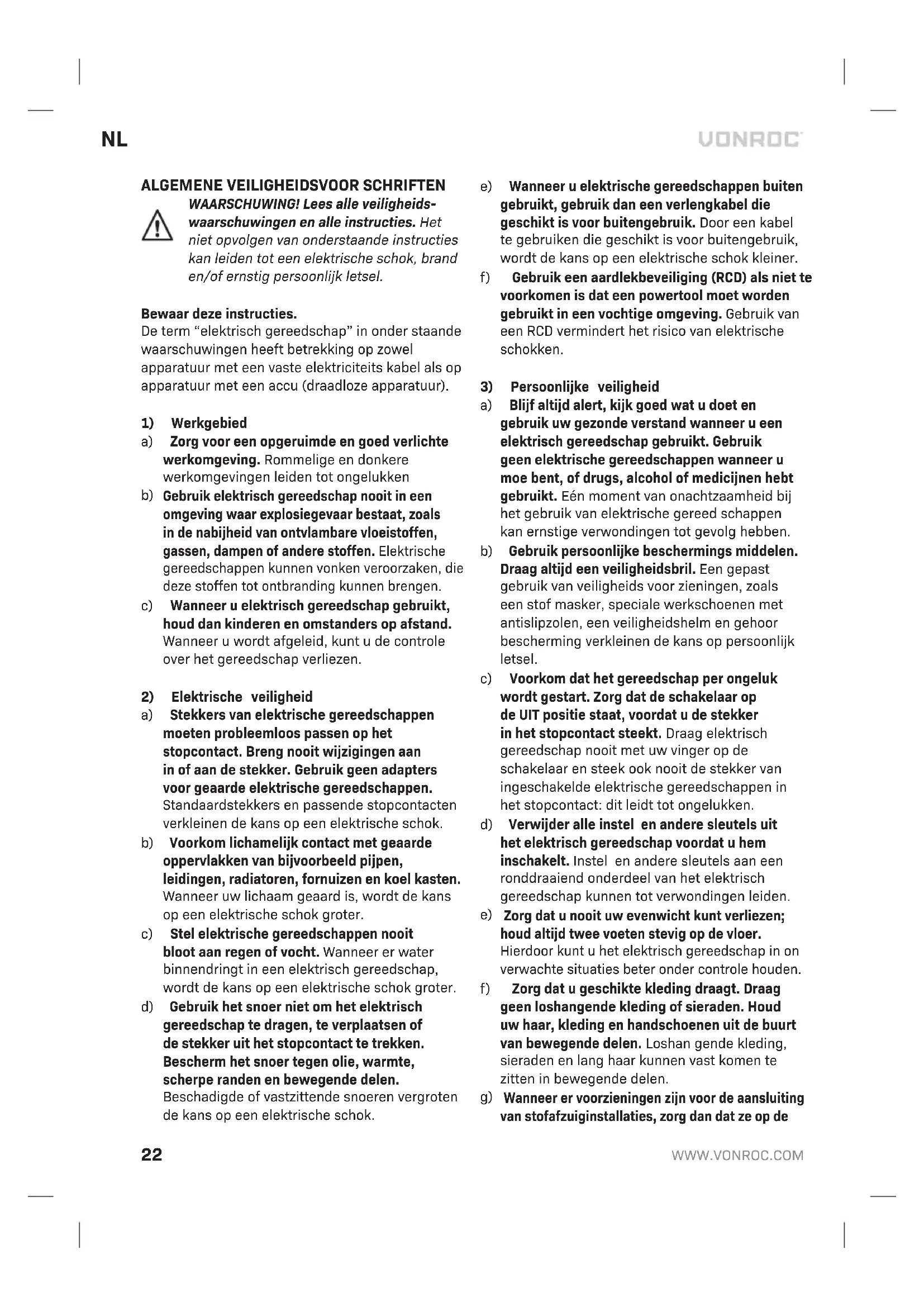 Zorg dat de ventilatiesleuven vrij van stof en vuil zijn. Gebruik bij hardnekkig vuil een zachte doek bevochtigd met zeepwater. Gebruik geen oplosmid- delen als benzine, alcohol, ammonia, etc. Dergelijke stoffen beschadigen de kunststof onderdelen. MILIEU Defecte en/of afgedankte elektrische of elektronische gereedschappen dienen ter verwerking te worden aangeboden aan een daarvoor verantwoordelijke instantie. Uitsluitend voor EG-landen Werp elektrisch gereedschap niet weg bij het huisvuil. Volgens de Europese Richtlijn 2012/19/ EU voor Afgedankte Elektrische en Elektronische Apparatuur en de implementatie ervan in nationaal recht moet niet langer te gebruiken elektrisch gereedschap gescheiden worden verzameld en op een milieuvriendelijke wijze worden verwerkt. GARANTIE VONROC producten zijn ontworpen volgens de hoogste kwaliteitsstandaarden en gegarandeerd vrij van defecten, zowel materieel als fabrieksfouten, tijdens de wettelijk vastgestelde garantieperiode vanaf de eerste aankoopdatum. Mocht het product tijdens deze periode gebreken vertonen veroorzaakt door defecte materialen en/of fabrieksfouten, neem dan rechtstreeks contact op met VONROC. De volgende situaties vallen niet onder de garantie: