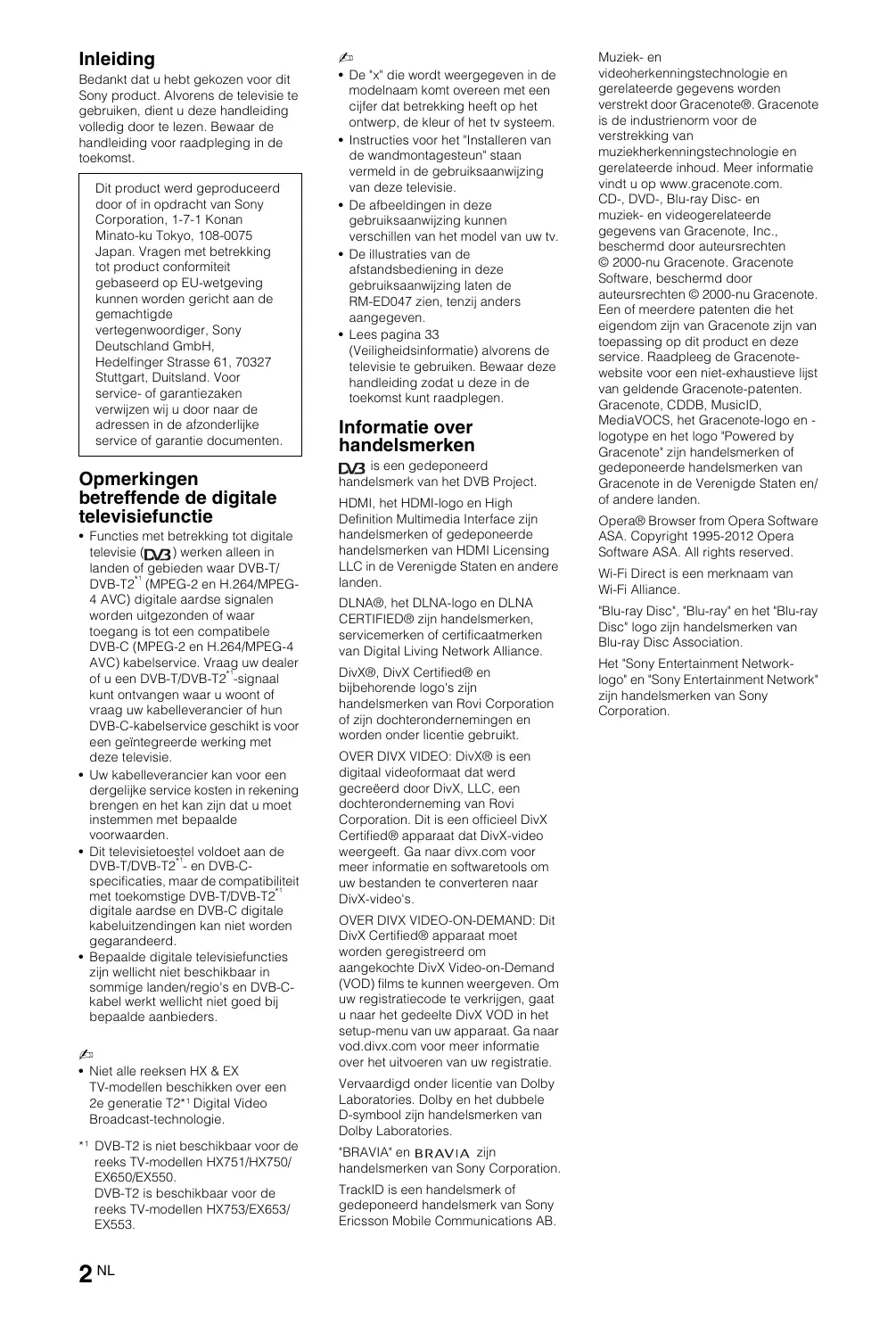- Lees pagina 33 (Veiligheidsinformatie) alvorens de televisie te gebruiken. Bewaar deze handleiding zodat u deze in de toekomst kunt raadplegen. Informatie over handelsmerken is een gedeponeerd handelsmerk van het DVB Project. HDMI, het HDMI-logo en High Definition Multimedia Interface zijn handelsmerken of gedeponeerde handelsmerken van HDMI Licensing LLC in de Verenigde Staten en andere landen. DLNA®, het DLNA-logo en DLNA CERTIFIED® zijn handelsmerken, servicemerken of certificaatmerken van Digital Living Network Alliance. DivX®, DivX Certified® en bijbehorende logo's zijn handelsmerken van Rovi Corporation of zijn dochterondernemingen en worden onder licentie gebruikt. OVER DIVX VIDEO: DivX® is een digitaal videoformaat dat werd gecreëerd door DivX, LLC, een dochteronderneming van Rovi Corporation. Dit is een officieel DivX Certified® apparaat dat DivX-video weergeeft. Ga naar divx.com voor meer informatie en softwaretools om uw bestanden te converteren naar DivX-video's. OVER DIVX VIDEO-ON-DEMAND: Dit DivX Certified® apparaat moet worden geregistreerd om aangekochte DivX Video-on-Demand (VOD) films te kunnen weergeven. Om uw registratiecode te verkrijgen, gaat u naar het gedeelte DivX VOD in het setup-menu van uw apparaat. Ga naar vod.divx.com voor meer informatie over het uitvoeren van uw registratie. Vervaardigd onder licentie van Dolby Laboratories. Dolby en het dubbele D-symbool zijn handelsmerken van Dolby Laboratories. "BRAVIA" en zijn handelsmerken van Sony Corporation. TrackID is een handelsmerk of gedeponeerd handelsmerk van Sony Ericsson Mobile Communications AB. Muziek- en videoherkenningstechnologie en gerelateerde gegevens worden verstrekt door Gracenote®. Gracenote is de industrienorm voor de verstrekking van muziekherkenningstechnologie en gerelateerde inhoud. Meer informatie vindt u op www.gracenote.com. CD-, DVD-, Blu-ray Disc- en muziek- en videogerelateerde gegevens van Gracenote, Inc., beschermd door auteursrechten © 2000-nu Gracenote. Gracenote Software, beschermd door auteursrechten © 2000-nu Gracenote. Een of meerdere patenten die het eigendom zijn van Gracenote zijn van toepassing op dit product en deze service. Raadpleeg de Gracenotewebsite voor een niet-exhaustieve lijst van geldende Gracenote-patenten. Gracenote, CDDB, MusicID, MediaVOCS, het Gracenote-logo en logotype en het logo "Powered by Gracenote" zijn handelsmerken of gedeponeerde handelsmerken van Gracenote in de Verenigde Staten en/ of andere landen. Opera® Browser from Opera Software ASA. Copyright 1995-2012 Opera Software ASA. All rights reserved. Wi-Fi Direct is een merknaam van Wi-Fi Alliance. "Blu-ray Disc", "Blu-ray" en het "Blu-ray Disc" logo zijn handelsmerken van Blu-ray Disc Association. Het "Sony Entertainment Networklogo" en "Sony Entertainment Network" zijn handelsmerken van Sony Corporation. Opmerking voor draadloos signaal