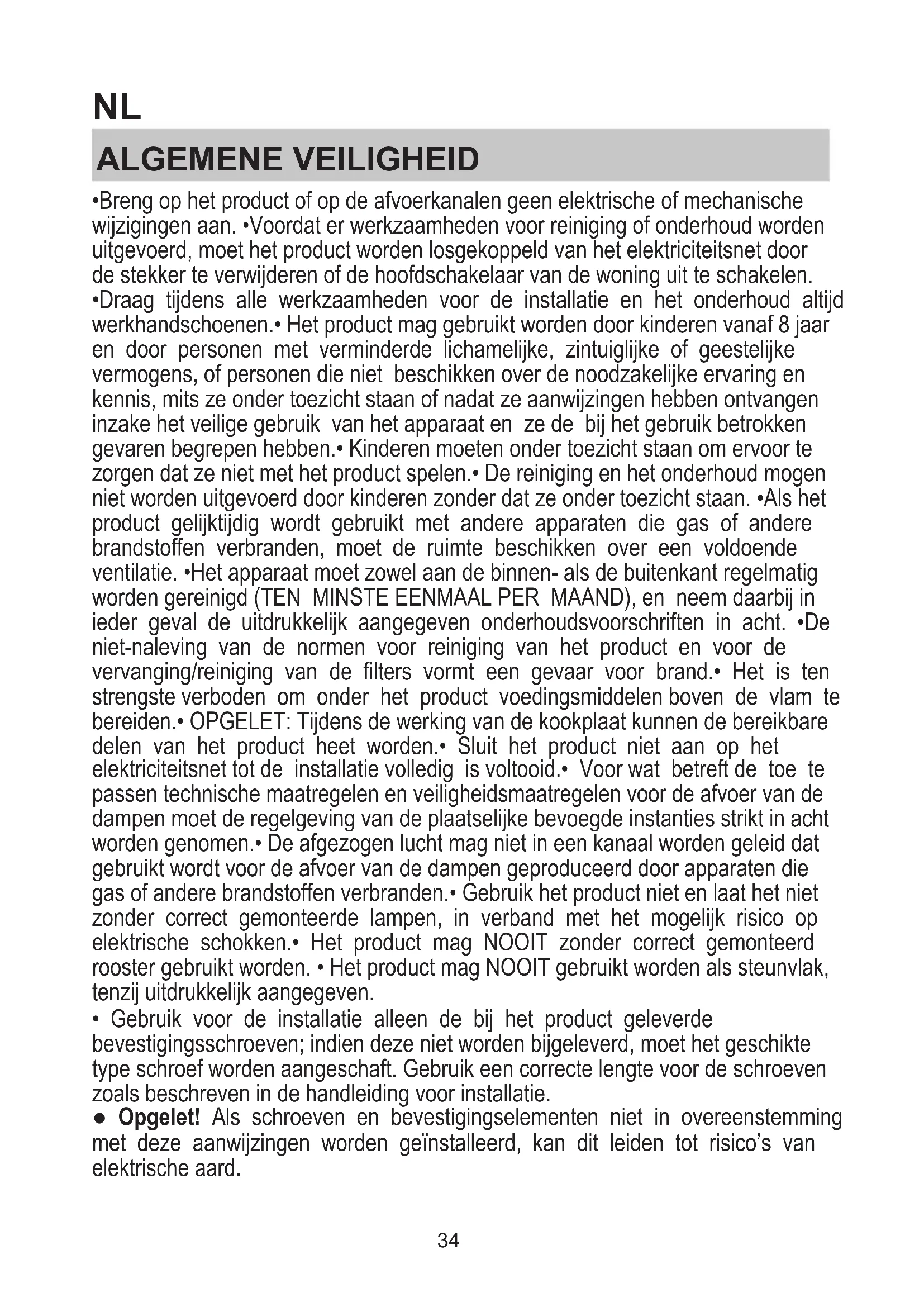 - Draag tijdens alle werkzaamheden voor de installatie en het onderhoud altijd werkhandschoenen.• Het product mag gebruikt worden door kinderen vanaf 8 jaar en door personen met verminderde lichamelijke, zintuiglijke of geestelijke vermogens, of personen die niet beschikken over de noodzakelijke ervaring en kennis, mits ze onder toezicht staan of nadat ze aanwijzingen hebben ontvangen inzake het veilige gebruik van het apparaat en ze de bij het gebruik betrokken gevaren begrepen hebben.• Kinderen moeten onder toezicht staan om ervoor te zorgen dat ze niet met het product spelen.• De reiniging en het onderhoud mogen niet worden uitgevoerd door kinderen zonder dat ze onder toezicht staan. •Als het product gelijktijdig wordt gebruikt met andere apparaten die gas of andere brandstoffen verbranden, moet de ruimte beschikken over een voldoende ventilatie. •Het apparaat moet zowel aan de binnen- als de buitenkant regelmatig worden gereinigd (TEN MINSTE EENMAAL PER MAAND), en neem daarbij in ieder geval de uitdrukkelijk aangegeven onderhoudsvoorschriften in acht. •De niet-naleving van de normen voor reiniging van het product en voor de vervanging/reiniging van de filters vormt een gevaar voor brand.• Het is ten strengste verboden om onder het product voedingsmiddelen boven de vlam te bereiden.• OPGELET: Tijdens de werking van de kookplaat kunnen de bereikbare delen van het product heet worden.• Sluit het product niet aan op het elektriciteitsnet tot de installatie volledig is voltooid.• Voor wat betreft de toe te passen technische maatregelen en veiligheidsmaatregelen voor de afvoer van de dampen moet de regelgeving van de plaatselijke bevoegde instanties strikt in acht worden genomen.• De afgezogen lucht mag niet in een kanaal worden geleid dat gebruikt wordt voor de afvoer van de dampen geproduceerd door apparaten die gas of andere brandstoffen verbranden.• Gebruik het product niet en laat het niet zonder correct gemonteerde lampen, in verband met het mogelijk risico op elektrische schokken.• Het product mag NOOIT zonder correct gemonteerd rooster gebruikt worden. • Het product mag NOOIT gebruikt worden als steunvlak, tenzij uitdrukkelijk aangegeven.