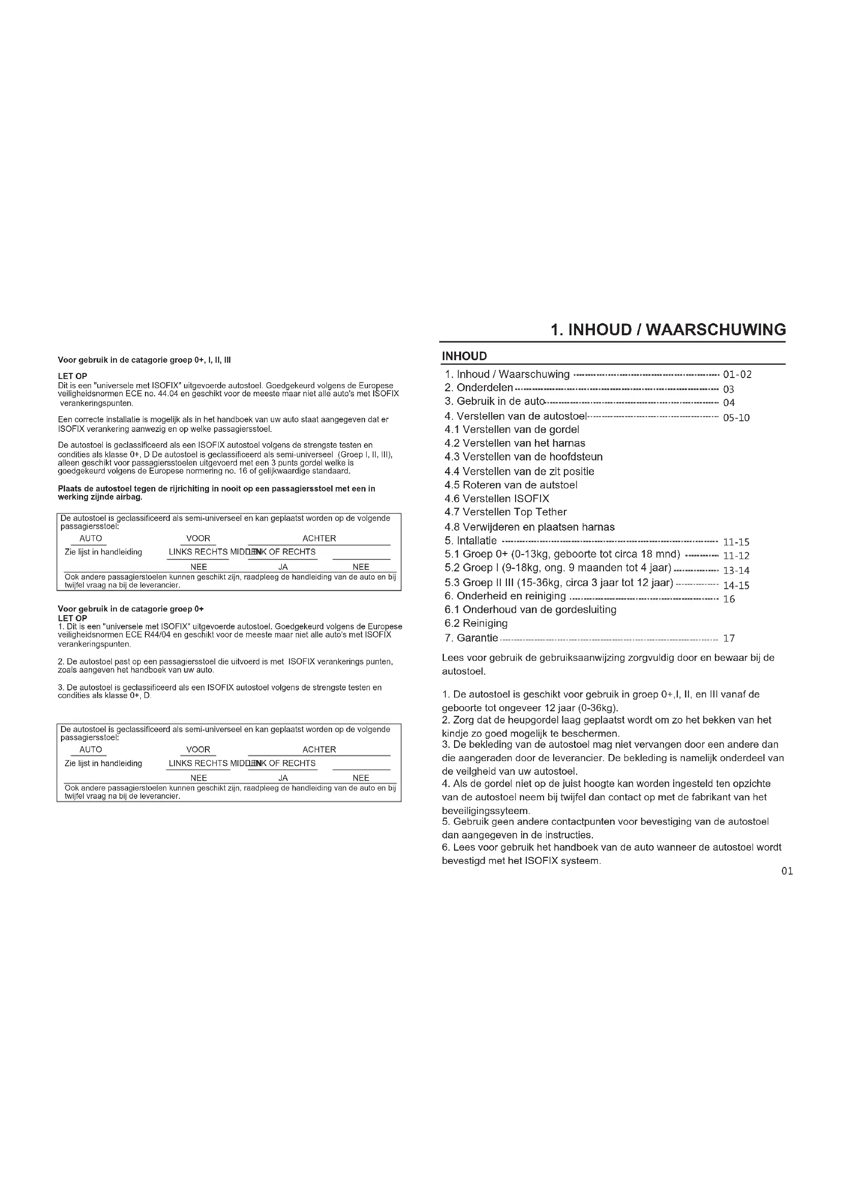 1. De autostoel is geschikt voor gebruik in groep 0+,I, II, en III vanaf de