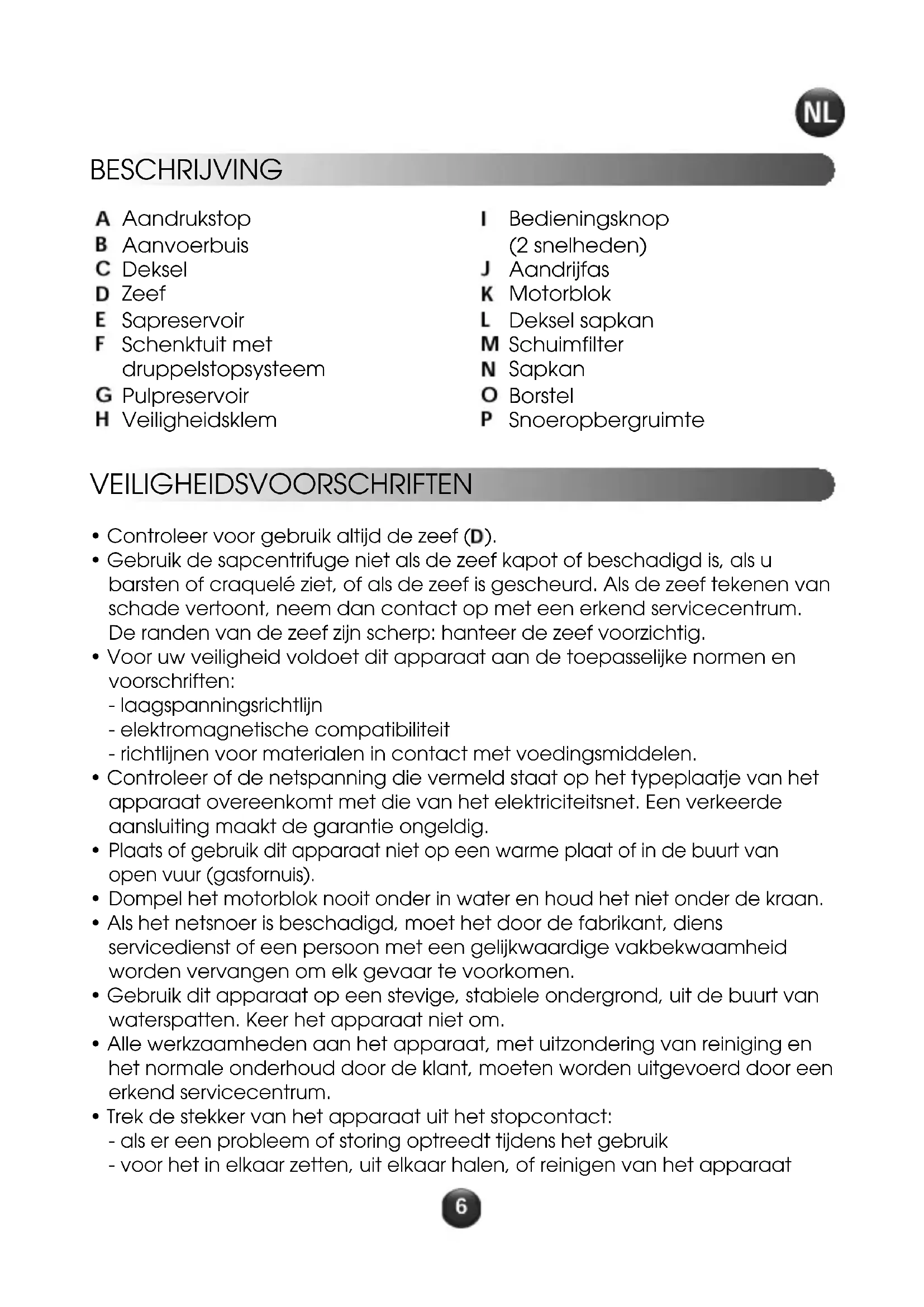 - Trek na gebruik altijd de stekker uit het stopcontact. VEILIGHEIDSSYSTEEM Dit apparaat is voorzien van een veiligheidsmechanisme. Om de sapcentrifuge te starten, dient het deksel (