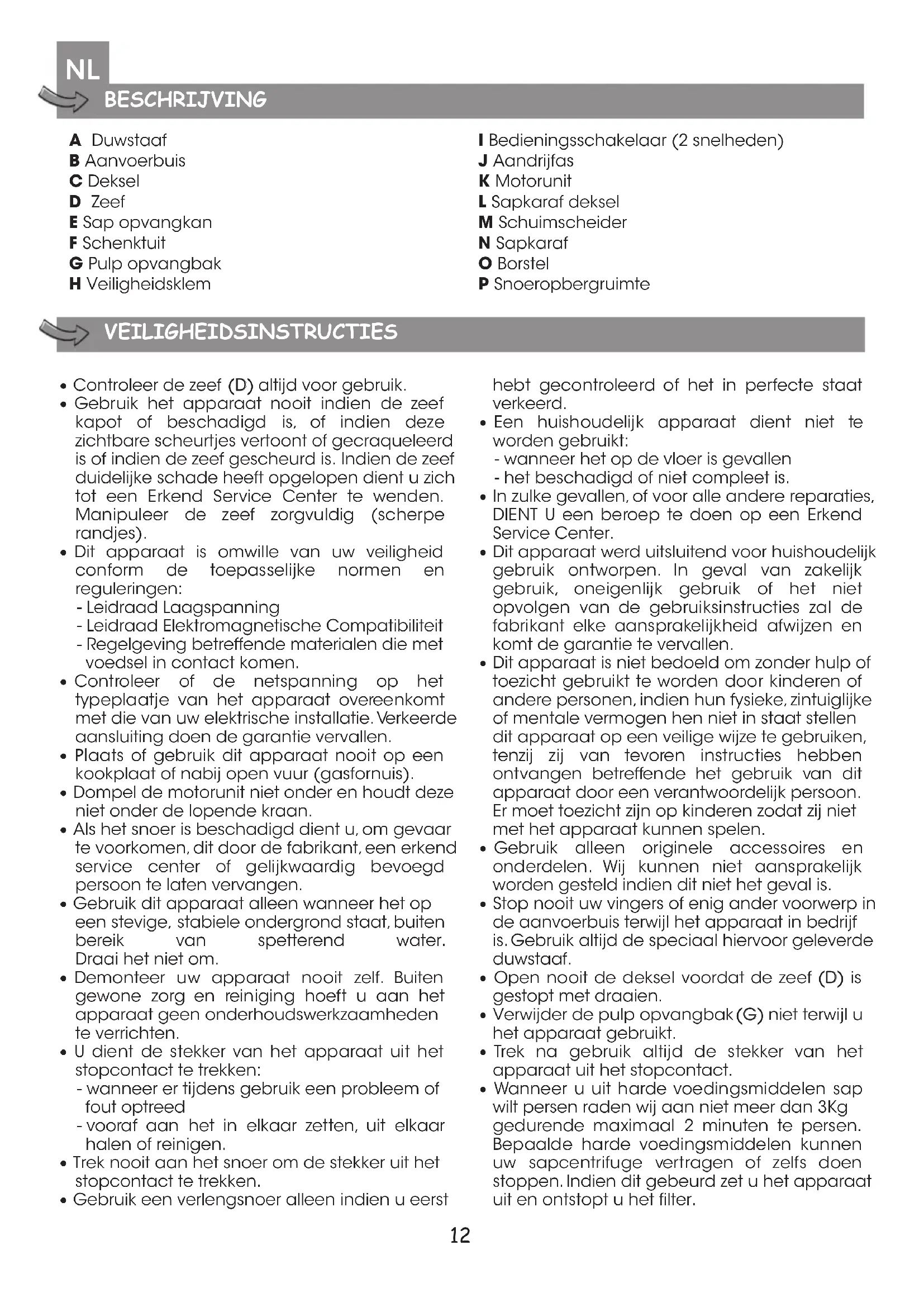 - Wanneer u uit harde voedingsmiddelen sap wilt persen raden wij aan niet meer dan 3Kg gedurende maximaal 2 minuten te persen. Bepaalde harde voedingsmiddelen kunnen uw sapcentrifuge vertragen of zelfs doen stoppen. Indien dit gebeurd zet u het apparaat uit en ontstopt u het filter. NL13 BEVEILIGINGSSYSTEEM