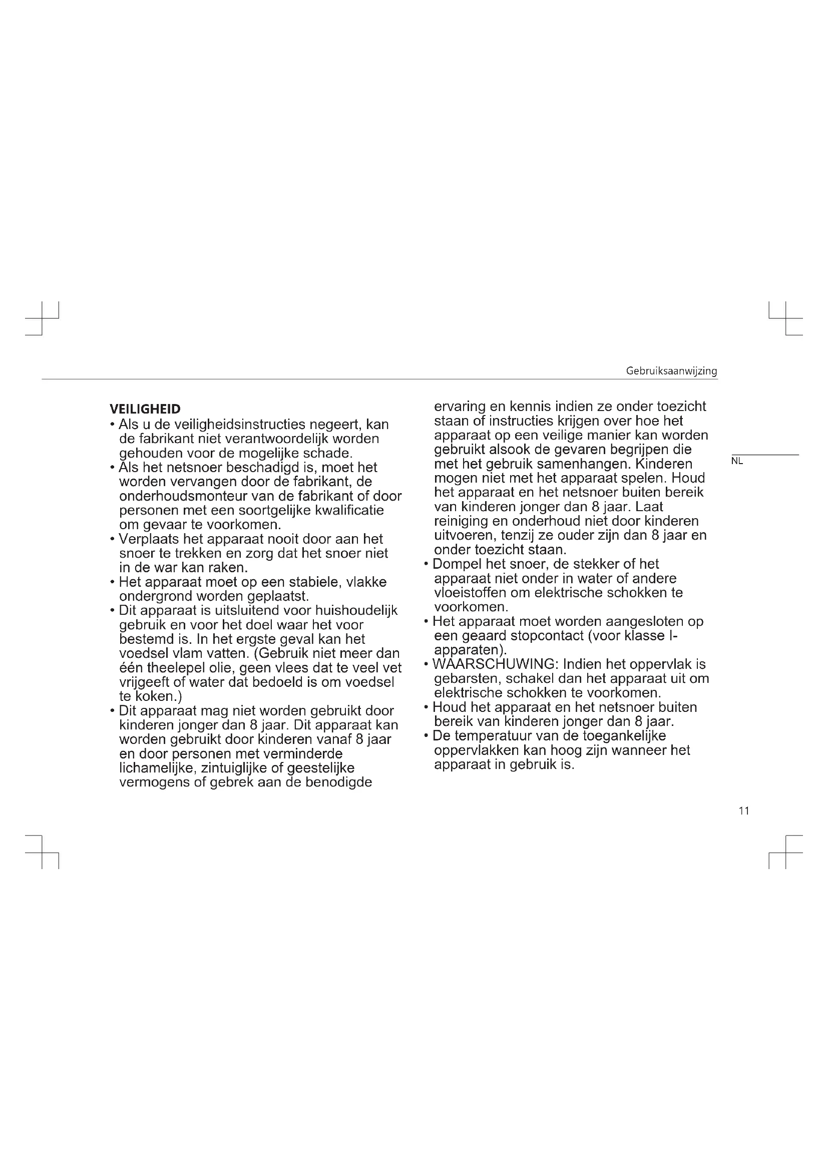 - Dit apparaat mag niet worden gebruikt door kinderen jonger dan 8 jaar. Dit apparaat kan worden gebruikt door kinderen vanaf 8 jaar en door personen met verminderde lichamelijke, zintuiglijke of geestelijke vermogens of gebrek aan de benodigde ervaring en kennis indien ze onder toezicht staan of instructies krijgen over hoe het apparaat op een veilige manier kan worden gebruikt alsook de gevaren begrijpen die met het gebruik samenhangen. Kinderen mogen niet met het apparaat spelen. Houd het apparaat en het netsnoer buiten bereik van kinderen jonger dan 8 jaar. Laat reiniging en onderhoud niet door kinderen uitvoeren, tenzij ze ouder zijn dan 8 jaar en onder toezicht staan.