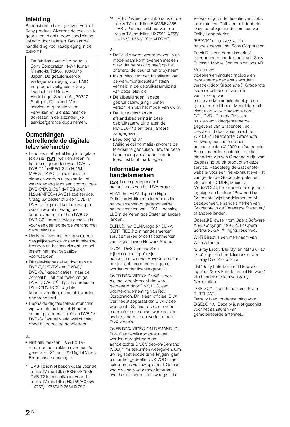 - Lees pagina 37 (Veiligheidsinformatie) alvorens de televisie te gebruiken. Bewaar deze handleiding zodat u deze in de toekomst kunt raadplegen. Informatie over handelsmerken is een gedeponeerd handelsmerk van het DVB Project. HDMI, het HDMI-logo en High Definition Multimedia Interface zijn handelsmerken of gedeponeerde handelsmerken van HDMI Licensing LLC in de Verenigde Staten en andere landen. DLNA®, het DLNA-logo en DLNA CERTIFIED® zijn handelsmerken, servicemerken of certificaatmerken van Digital Living Network Alliance. DivX®, DivX Certified® en bijbehorende logo's zijn handelsmerken van Rovi Corporation of zijn dochterondernemingen en worden onder licentie gebruikt. OVER DIVX VIDEO: DivX® is een digitaal videoformaat dat werd gecreëerd door DivX, LLC, een dochteronderneming van Rovi Corporation. Dit is een officieel DivX Certified® apparaat dat DivX-video weergeeft. Ga naar divx.com voor meer informatie en softwaretools om uw bestanden te converteren naar DivX-video's. OVER DIVX VIDEO-ON-DEMAND: Dit DivX Certified® apparaat moet worden geregistreerd om aangekochte DivX Video-on-Demand (VOD) films te kunnen weergeven. Om uw registratiecode te verkrijgen, gaat u naar het gedeelte DivX VOD in het setup-menu van uw apparaat. Ga naar vod.divx.com voor meer informatie over het uitvoeren van uw registratie. Vervaardigd onder licentie van Dolby Laboratories. Dolby en het dubbele D-symbool zijn handelsmerken van Dolby Laboratories. "BRAVIA" en zijn handelsmerken van Sony Corporation. TrackID is een handelsmerk of gedeponeerd handelsmerk van Sony Ericsson Mobile Communications AB. Muziek- en videoherkenningstechnologie en gerelateerde gegevens worden verstrekt door Gracenote®. Gracenote is de industrienorm voor de verstrekking van muziekherkenningstechnologie en gerelateerde inhoud. Meer informatie vindt u op www.gracenote.com. CD-, DVD-, Blu-ray Disc- en muziek- en videogerelateerde gegevens van Gracenote, Inc., beschermd door auteursrechten © 2000-nu Gracenote. Gracenote Software, beschermd door auteursrechten © 2000-nu Gracenote. Een of meerdere patenten die het eigendom zijn van Gracenote zijn van toepassing op dit product en deze service. Raadpleeg de Gracenotewebsite voor een niet-exhaustieve lijst van geldende Gracenote-patenten. Gracenote, CDDB, MusicID, MediaVOCS, het Gracenote-logo en logotype en het logo "Powered by Gracenote" zijn handelsmerken of gedeponeerde handelsmerken van Gracenote in de Verenigde Staten en/ of andere landen. Opera® Browser from Opera Software ASA. Copyright 1995-2012 Opera Software ASA. All rights reserved. Wi-Fi Direct is een merknaam van Wi-Fi Alliance. "Blu-ray Disc", "Blu-ray" en het "Blu-ray Disc" logo zijn handelsmerken van Blu-ray Disc Association. Het "Sony Entertainment Networklogo" en "Sony Entertainment Network" zijn handelsmerken van Sony Corporation. DiSEqC™ is een handelsmerk van EUTELSAT. Deze tv biedt ondersteuning voor DiSEqC 1.0. Deze tv is niet geschikt voor het aansturen van gemotoriseerde antennes. Opmerking voor draadloos signaal