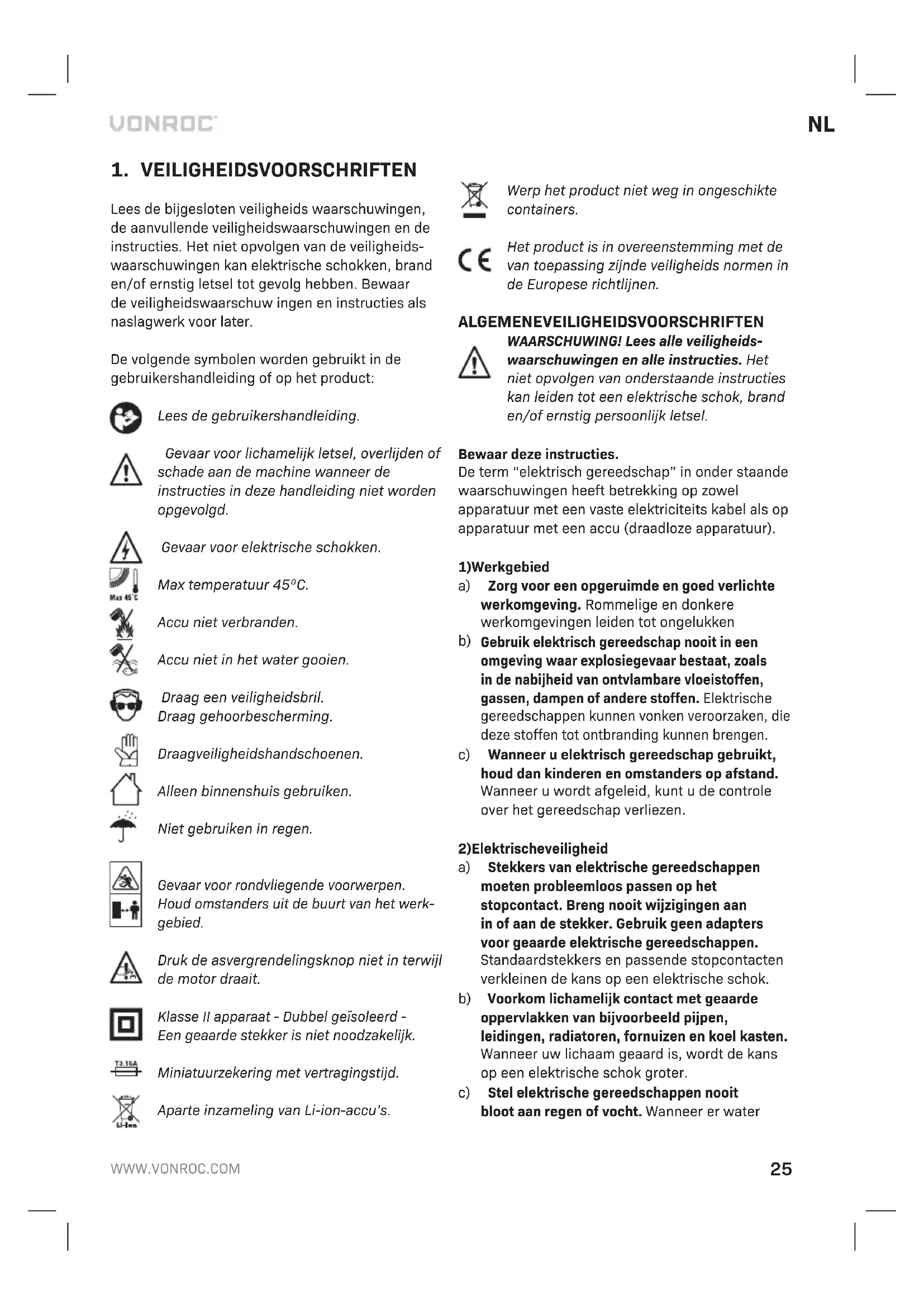 MILIEU Defecte en/of afgedankte elektrische of elektronische gereedschappen dienen ter verwerking te worden aangeboden aan een daarvoor verantwoordelijke instantie. Uitsluitend voor EG-landen Werp elektrisch gereedschap niet weg bij het huisvuil. Conform de Europese Richtlijn 2012/19/ EG voor Afgedankte Elektrische en Elektronische Apparatuur en de implementatie ervan in nationaal recht moet niet langer te gebruiken elektrisch gereedschap gescheiden worden verzameld en op een milieuvriendelijke wijze worden verwerkt. GARANTIE VONROC producten zijn ontworpen volgens de hoogste kwaliteitsstandaarden en gegarandeerd vrij van defecten, zowel materieel als fabrieksfouten, tijdens de wettelijk vastgestelde garantieperiode vanaf de eerste aankoopdatum. Mocht het product tijdens deze periode gebreken vertonen veroorzaakt door defecte materialen en/of fabrieksfouten, neem dan rechtstreeks contact op met VONROC. De volgende situaties vallen niet onder de garantie: